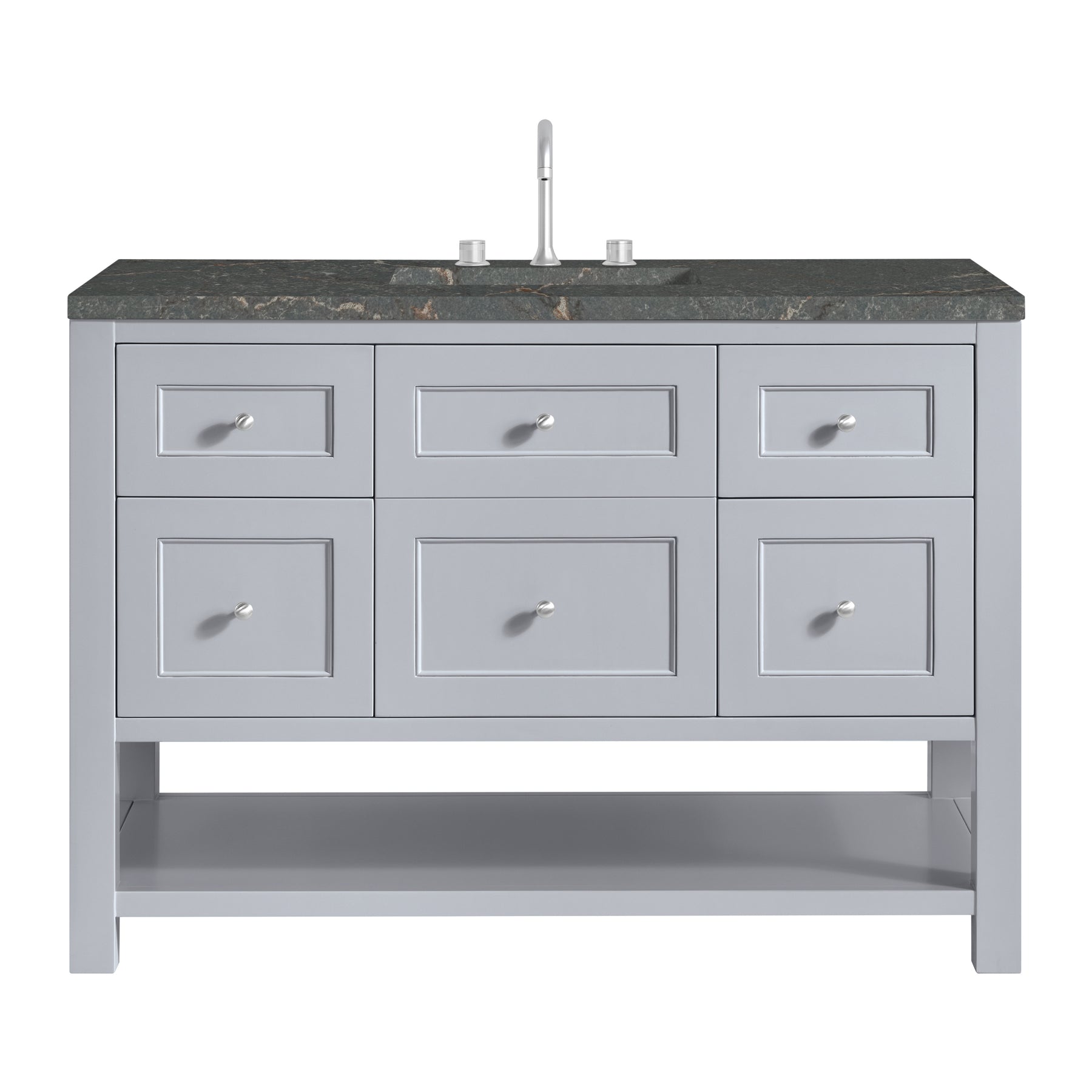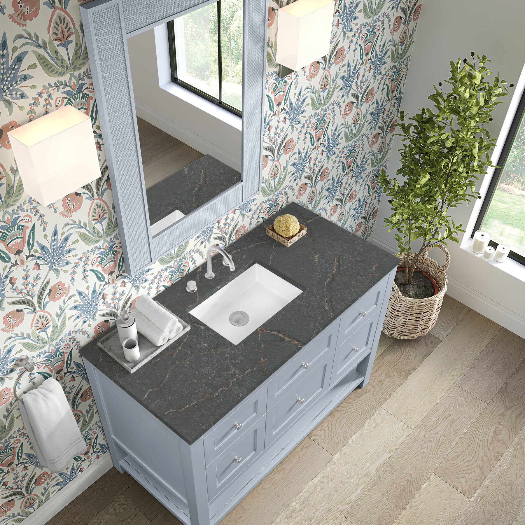 The Breckenridge 48" Single Vanity is a fresh take on traditional Mission furniture that easily transitions to Modern Farmhouse style with an air of understated sophistication. Satin Nickel knobs complement the Serenity Blue finish, while the neatly inset door and drawer fronts lend a fresh appeal to this clean-lined classic. A single-door cabinet opens to reveal an interior shelf equipped with convenient built-in USB/120V power outlet. This console-style vanity also features four full-extension drawers and an open lower shelf for additional storage. A gorgeous Parisien Bleu Silestone top with undermount sink completes the look.