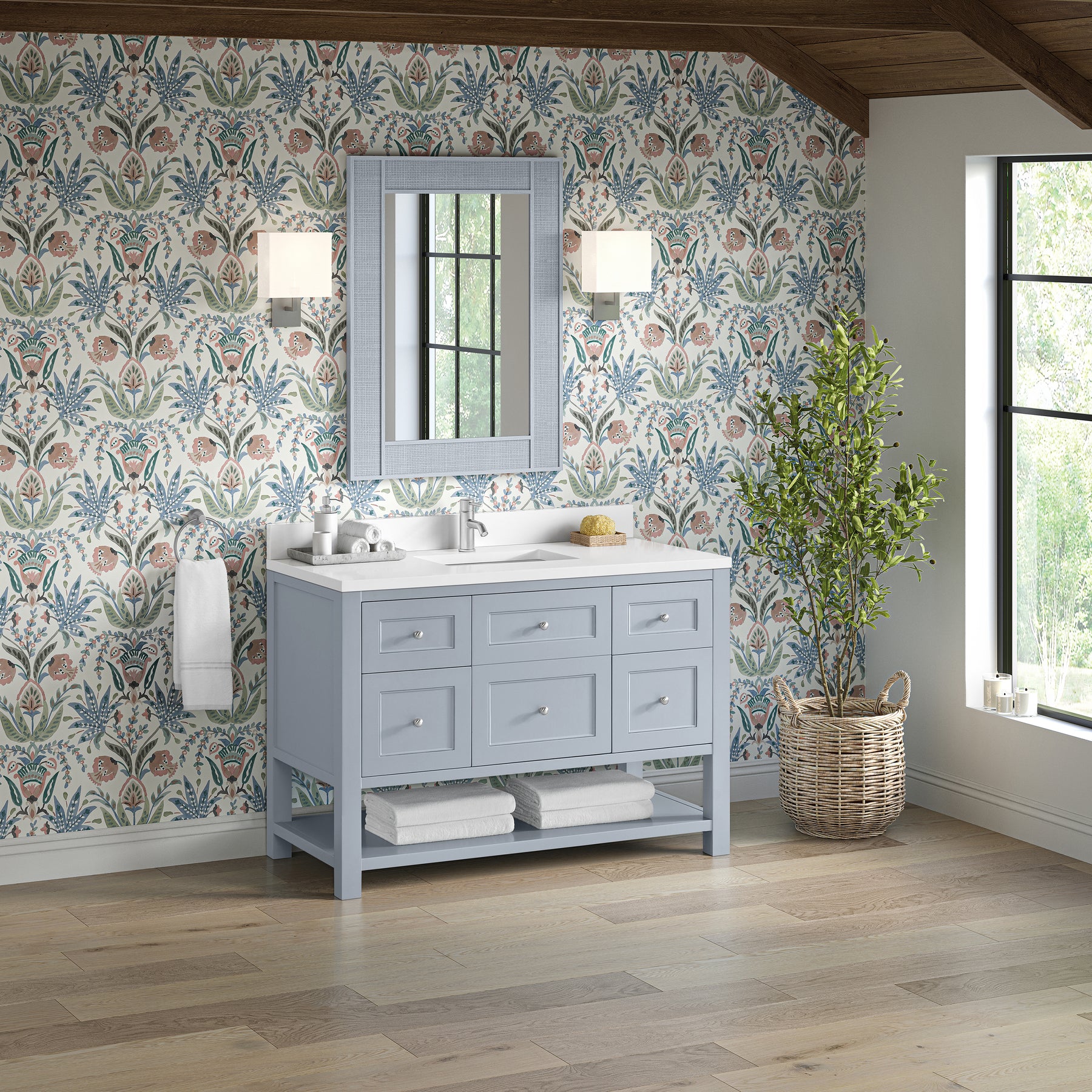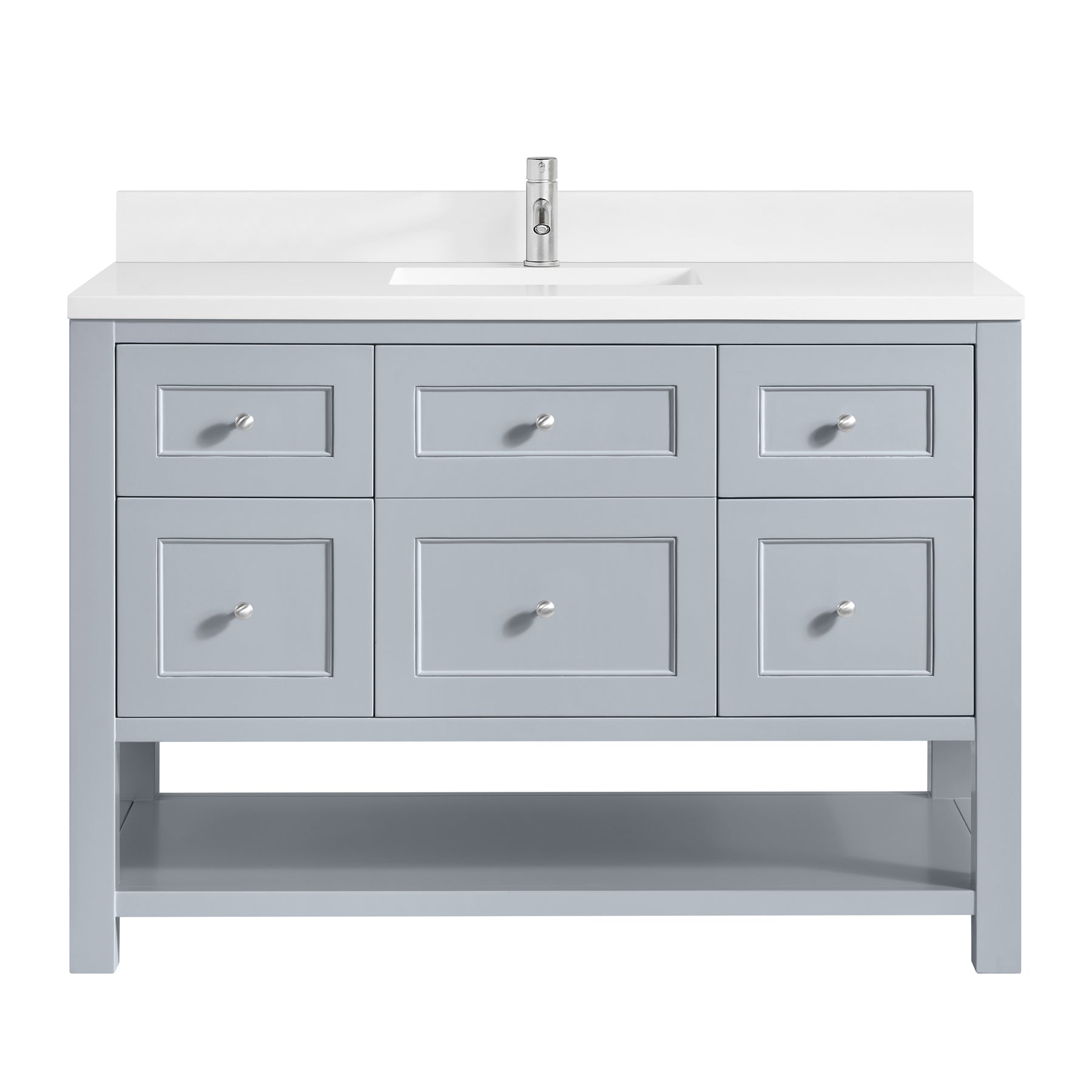 The Breckenridge 48" Single Vanity is a fresh take on traditional Mission furniture that easily transitions to Modern Farmhouse style with an air of understated sophistication. Satin Nickel knobs complement the Serenity Blue finish, while the neatly inset door and drawer fronts lend a fresh appeal to this clean-lined classic. A single-door cabinet opens to reveal an interior shelf equipped with convenient built-in USB/120V power outlet. This console-style vanity also features four full-extension drawers and an open lower shelf for additional storage. A single-hole faucet White Zeus Silestone top with undermount sink and backsplash complete the look with a contemporary touch.