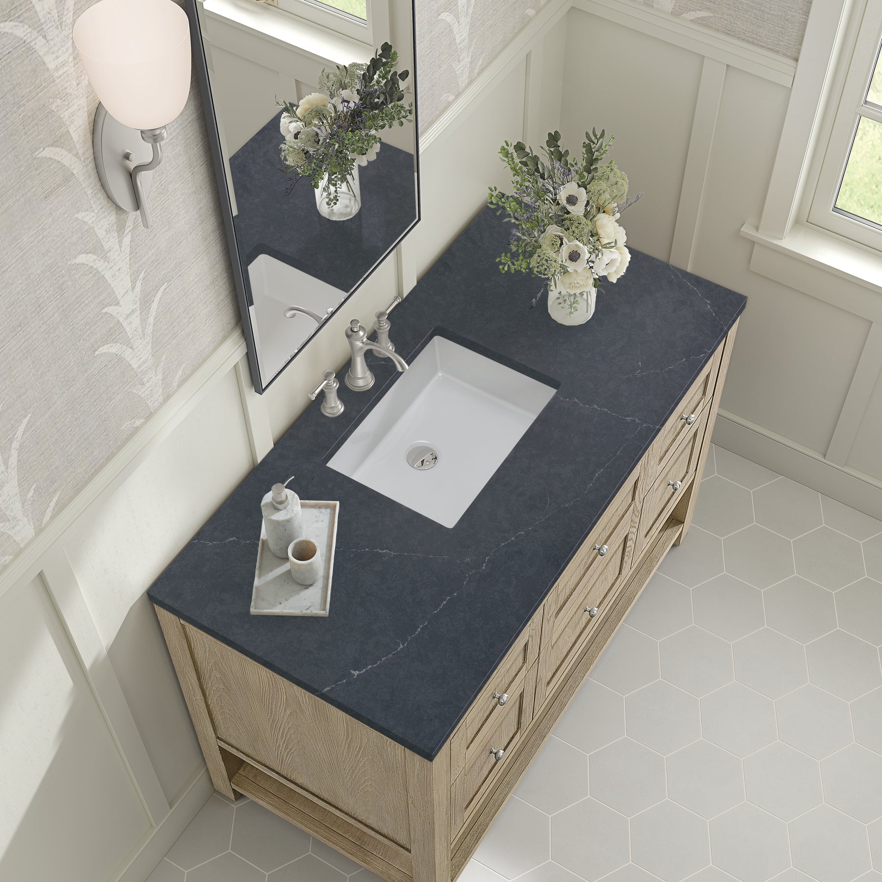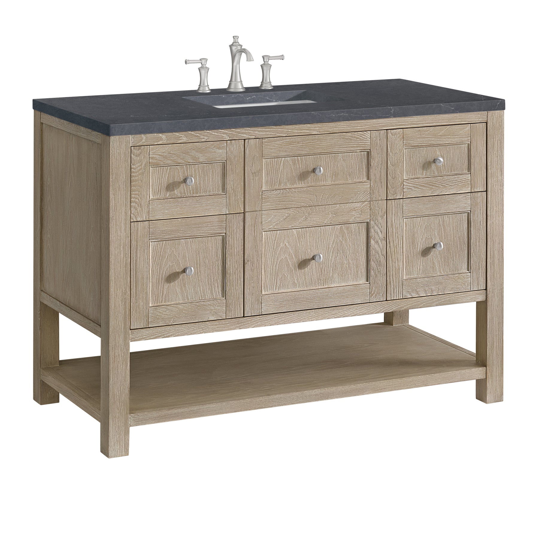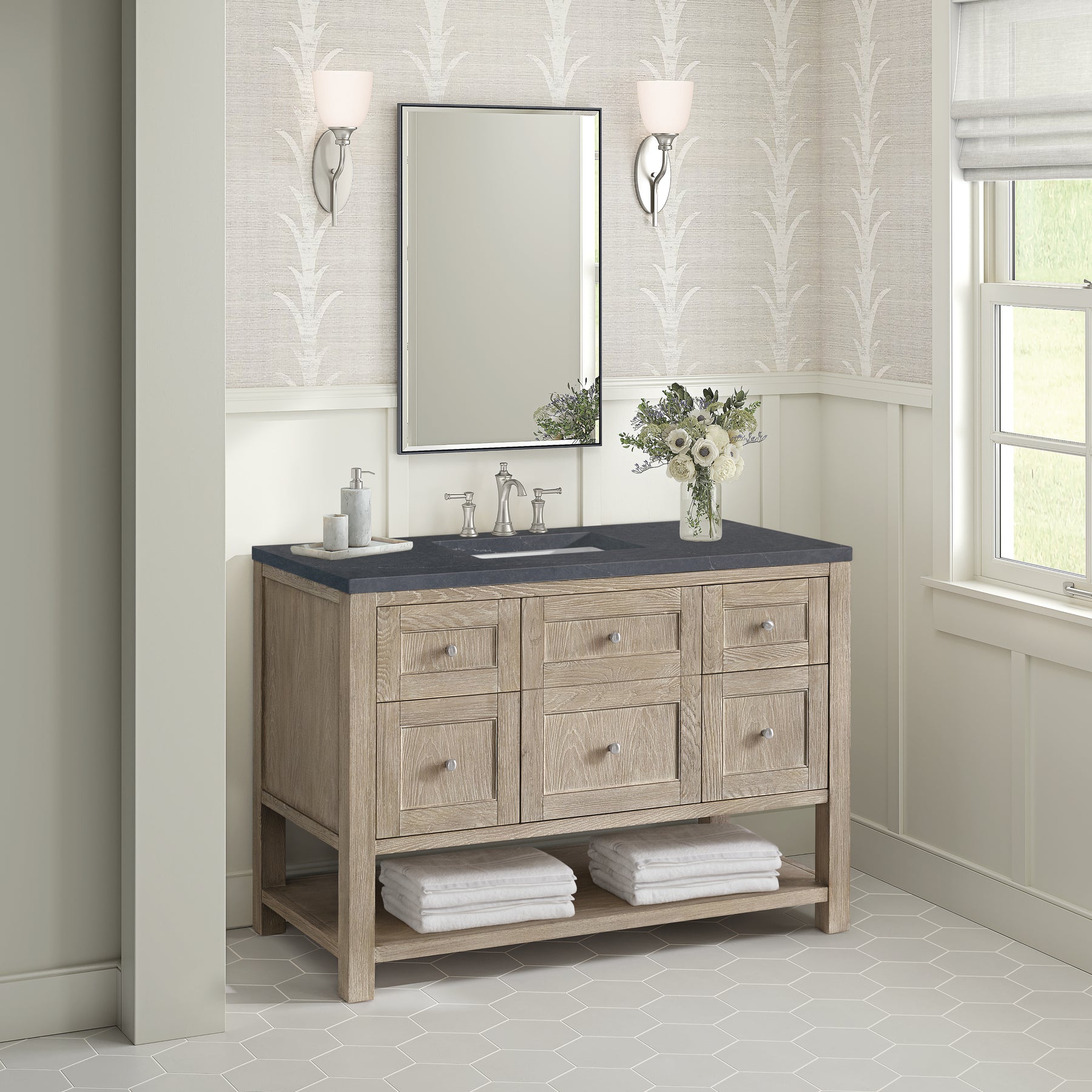 The Breckenridge 48" Single Vanity is a fresh take on traditional Mission furniture that easily transitions to Modern Farmhouse style with an air of understated sophistication. Satin Nickel knobs complement the Whitewashed Oak finish, while the neatly inset door and drawer fronts lend a fresh appeal to this clean-lined classic. A single-door cabinet opens to reveal an interior shelf equipped with convenient built-in USB/120V power outlet. This console-style vanity also features four full-extension drawers and an open lower shelf for additional storage. A suede-finished Charcoal Soapstone Silestone top with undermount sink completes the look.