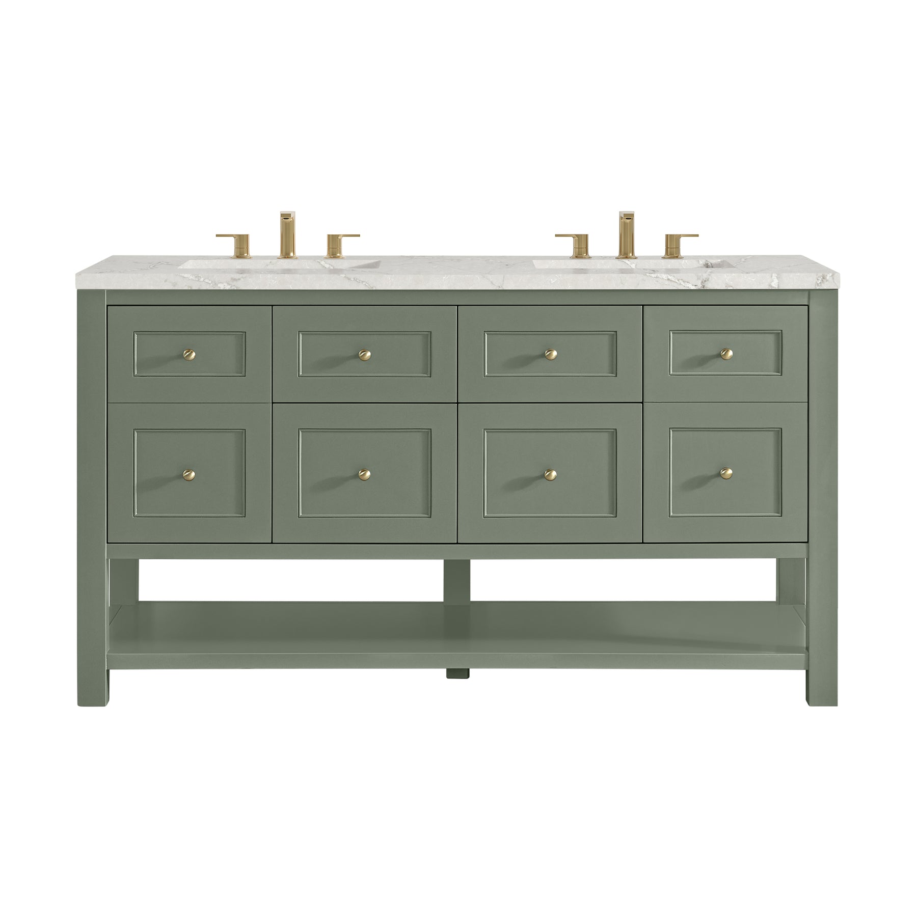 The Breckenridge 60" Double Vanity is a fresh take on traditional Mission furniture that easily transitions to Modern Farmhouse style with an air of understated sophistication. Champagne Brass knobs complement the Smokey Celadon finish, while the neatly inset door and drawer fronts lend a fresh appeal to this clean-lined classic. Two single-door cabinets open to reveal interior shelves equipped with a convenient built-in USB/120V power outlet. This console-style vanity also features two top-row tip-out drawers, two standard full-extension drawers, and an open lower shelf for additional storage. A beautiful Victorian Silver Silestone top with undermount sinks completes the look.