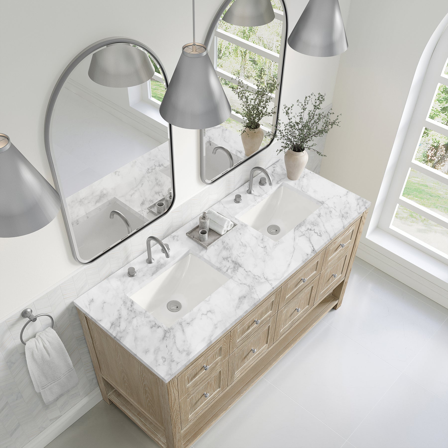 The Breckenridge 60" Double Vanity is a fresh take on traditional Mission furniture that easily transitions to Modern Farmhouse style with an air of understated sophistication. Satin Nickel knobs complement the Whitewashed Oak finish, while the neatly inset door and drawer fronts lend a fresh appeal to this clean-lined classic. Two single-door cabinets open to reveal interior shelves equipped with a convenient built-in USB/120V power outlet. This console-style vanity also features two top-row tip-out drawers, two standard full-extension drawers, and an open lower shelf for additional storage. A classic Carrara Marble top with undermount sinks completes the look.