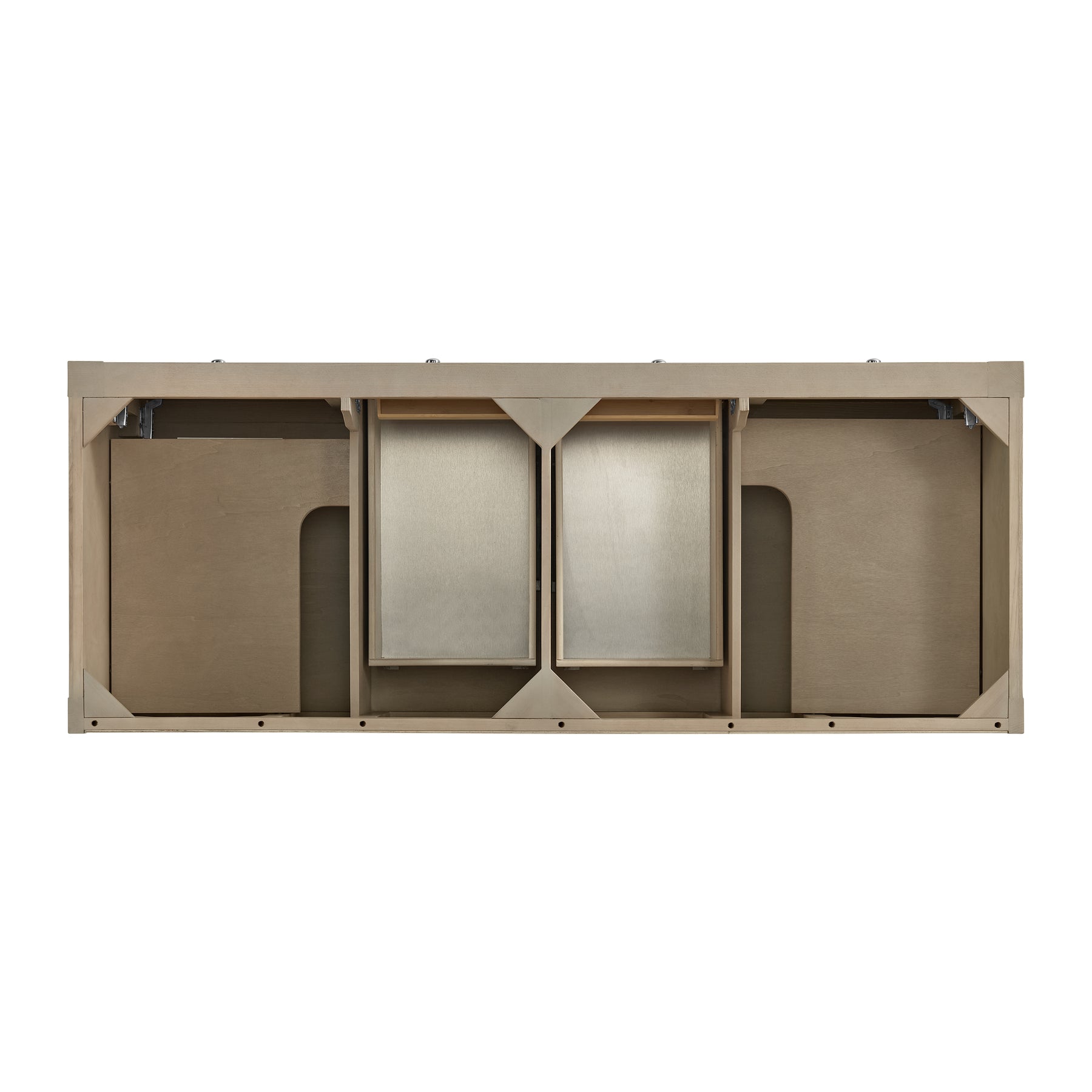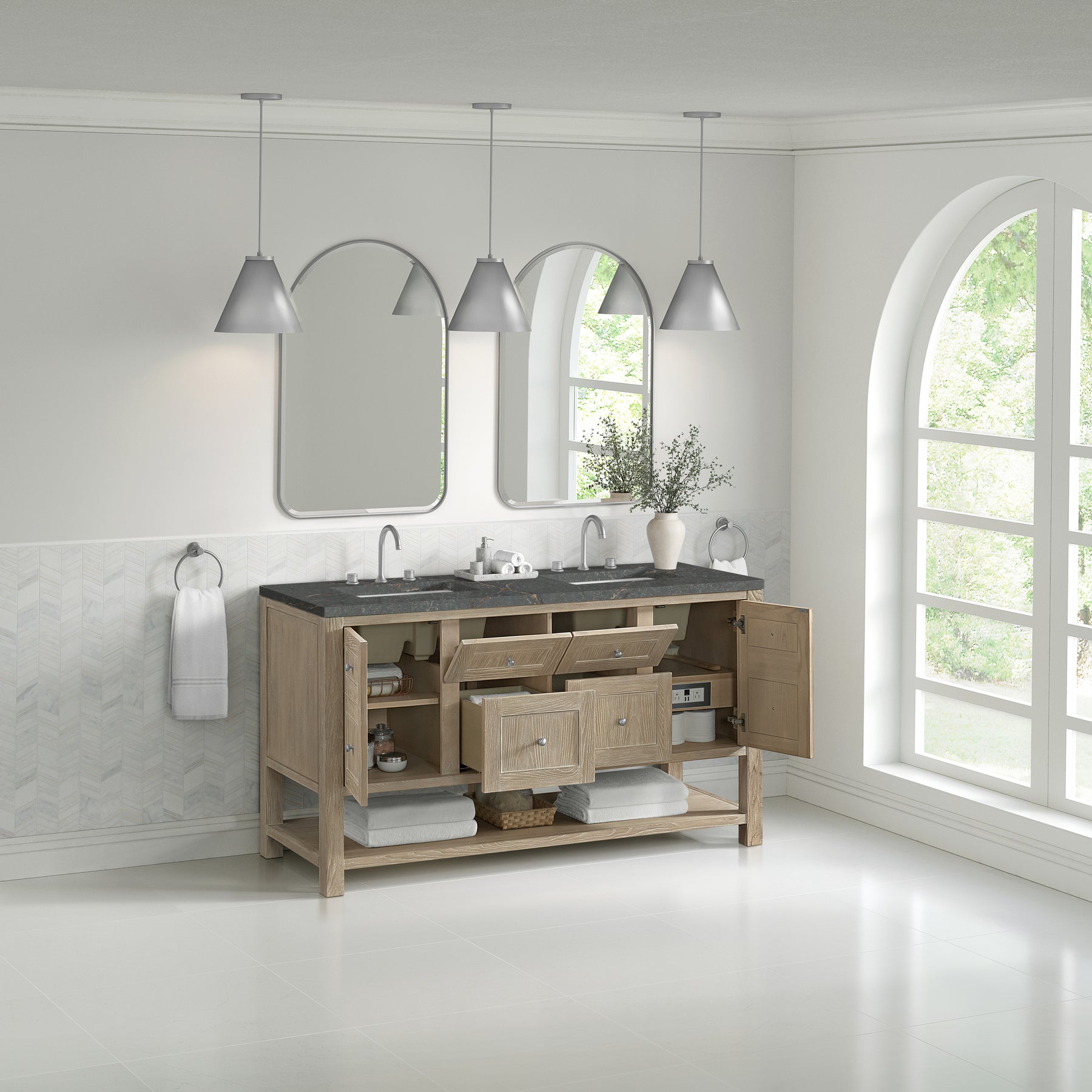 The Breckenridge 60" Double Vanity is a fresh take on traditional Mission furniture that easily transitions to Modern Farmhouse style with an air of understated sophistication. Satin Nickel knobs complement the Whitewashed Oak finish, while the neatly inset door and drawer fronts lend a fresh appeal to this clean-lined classic. Two single-door cabinets open to reveal interior shelves equipped with a convenient built-in USB/120V power outlet. This console-style vanity also features two top-row tip-out drawers, two standard full-extension drawers, and an open lower shelf for additional storage. A gorgeous Parisien Bleu Silestone top with undermount sinks completes the look.