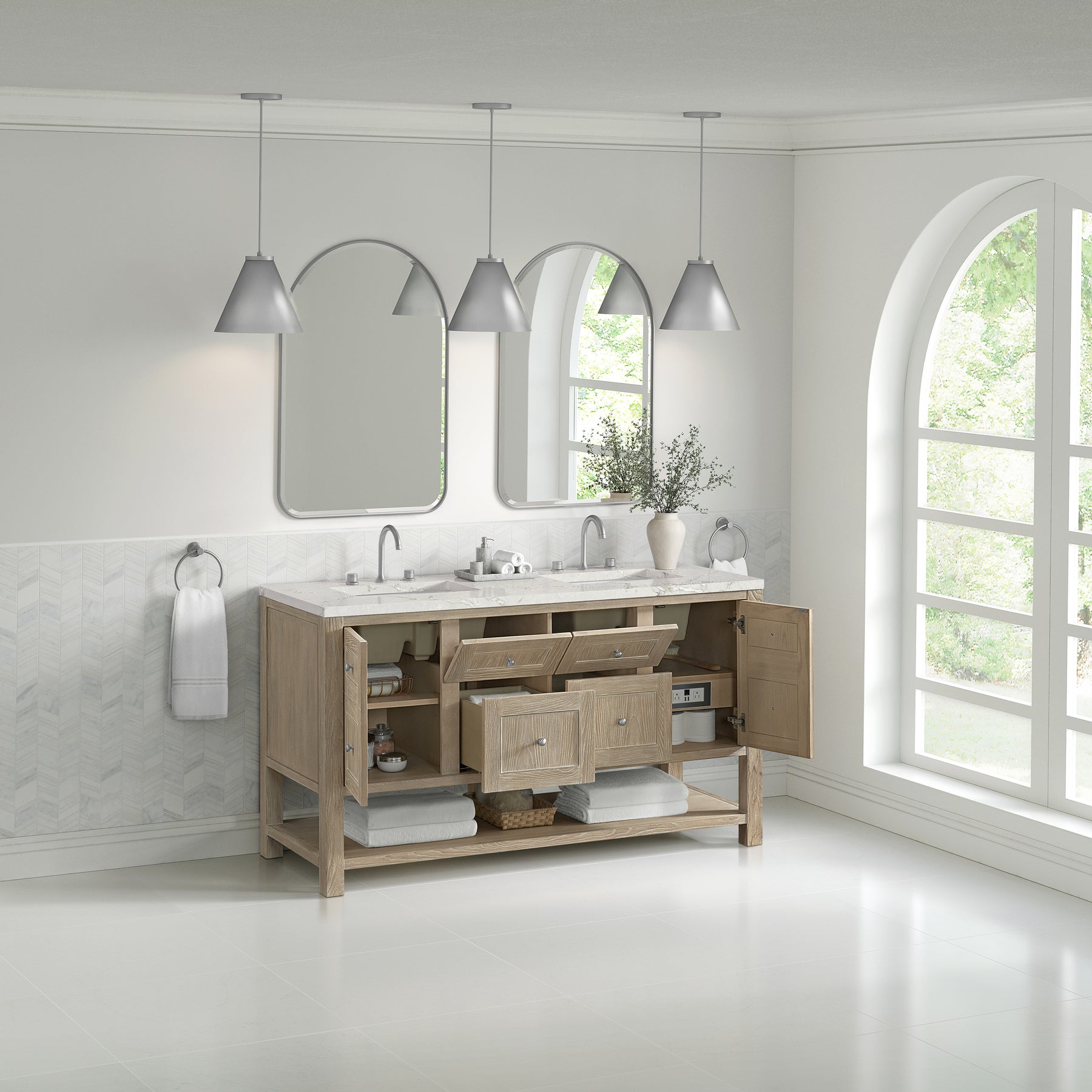 The Breckenridge 60" Double Vanity by James Martin Vanities is a fresh take on traditional Mission furniture that easily transitions to Modern Farmhouse style with an air of understated sophistication. Satin Nickel knobs complement the Whitewashed Oak finish, while the neatly inset door and drawer fronts lend a fresh appeal to this clean-lined classic. Two single-door cabinets open to reveal interior shelves equipped with a convenient built-in USB/120V power outlet. This console-style vanity also features two top-row tip-out drawers, two standard full-extension drawers, and an open lower shelf for additional storage. A beautiful Victorian Silver Silestone® top with undermount sinks completes the look.