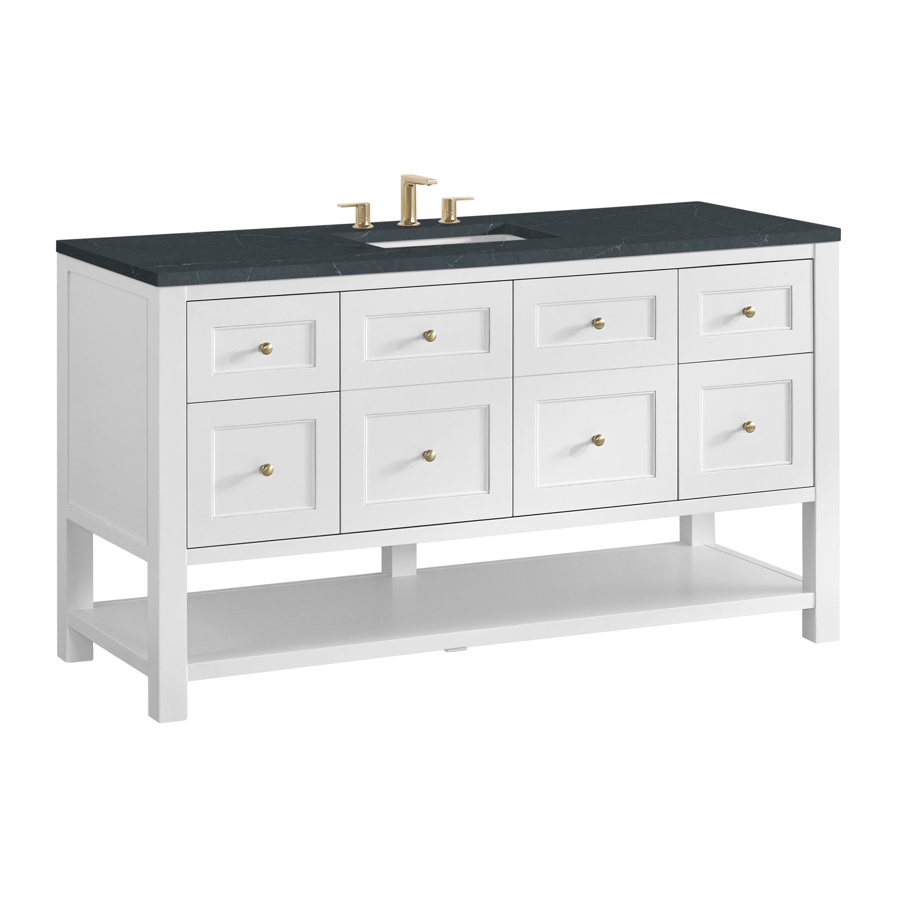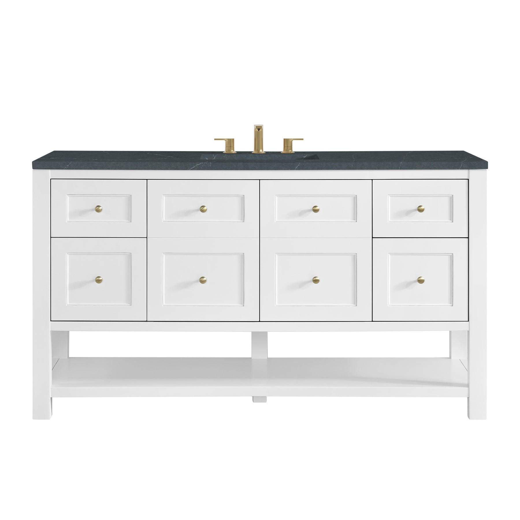 The Breckenridge 60" Single Vanity is a fresh take on traditional Mission furniture that easily transitions to Modern Farmhouse style with an air of understated sophistication. Champagne Brass knobs complement the Bright White finish, while the neatly inset door and drawer fronts lend a fresh appeal to this clean-lined classic. A two-door cabinet opens to reveal an interior shelf equipped with convenient built-in USB/120V power outlet. This console-style vanity also features four full-extension drawers and an open lower shelf for additional storage. A suede-finished Charcoal Soapstone Silestone top with undermount sink completes the look.