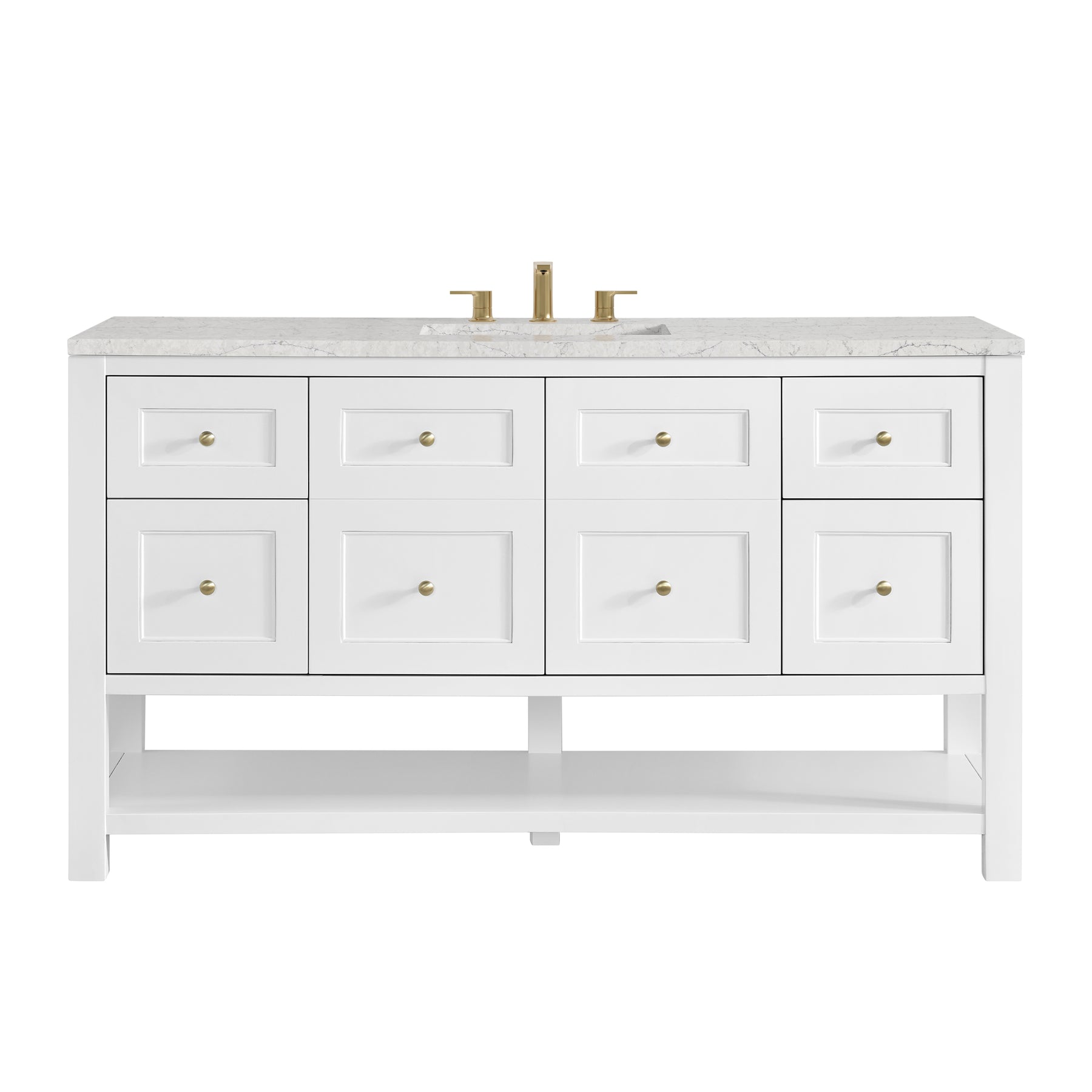 The Breckenridge 60" Single Vanity is a fresh take on traditional Mission furniture that easily transitions to Modern Farmhouse style with an air of understated sophistication. Champagne Brass knobs complement the Bright White finish, while the neatly inset door and drawer fronts lend a fresh appeal to this clean-lined classic. A two-door cabinet opens to reveal an interior shelf equipped with convenient built-in USB/120V power outlet. This console-style vanity also features four full-extension drawers and an open lower shelf for additional storage. A beautiful Eternal Jasmine Pearl Silestone top with undermount sink completes the look.