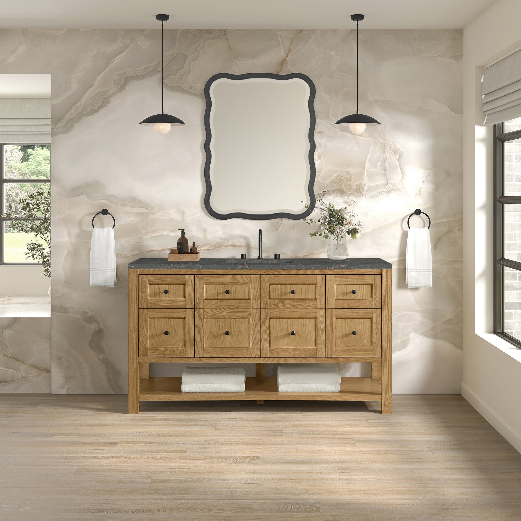 The Breckenridge 60" Single Vanity by James Martin Vanities is a fresh take on traditional Mission furniture that easily transitions to Modern Farmhouse style with an air of understated sophistication. Matte Black knobs complement the Light Natural Oak finish, while the neatly inset door and drawer fronts lend a fresh appeal to this clean-lined classic. A two-door cabinet opens to reveal an interior shelf equipped with convenient built-in USB/120V power outlet. This console-style vanity also features four full-extension drawers and an open lower shelf for additional storage. A gorgeous Parisien Bleu Silestone® top with undermount sink completes the look.