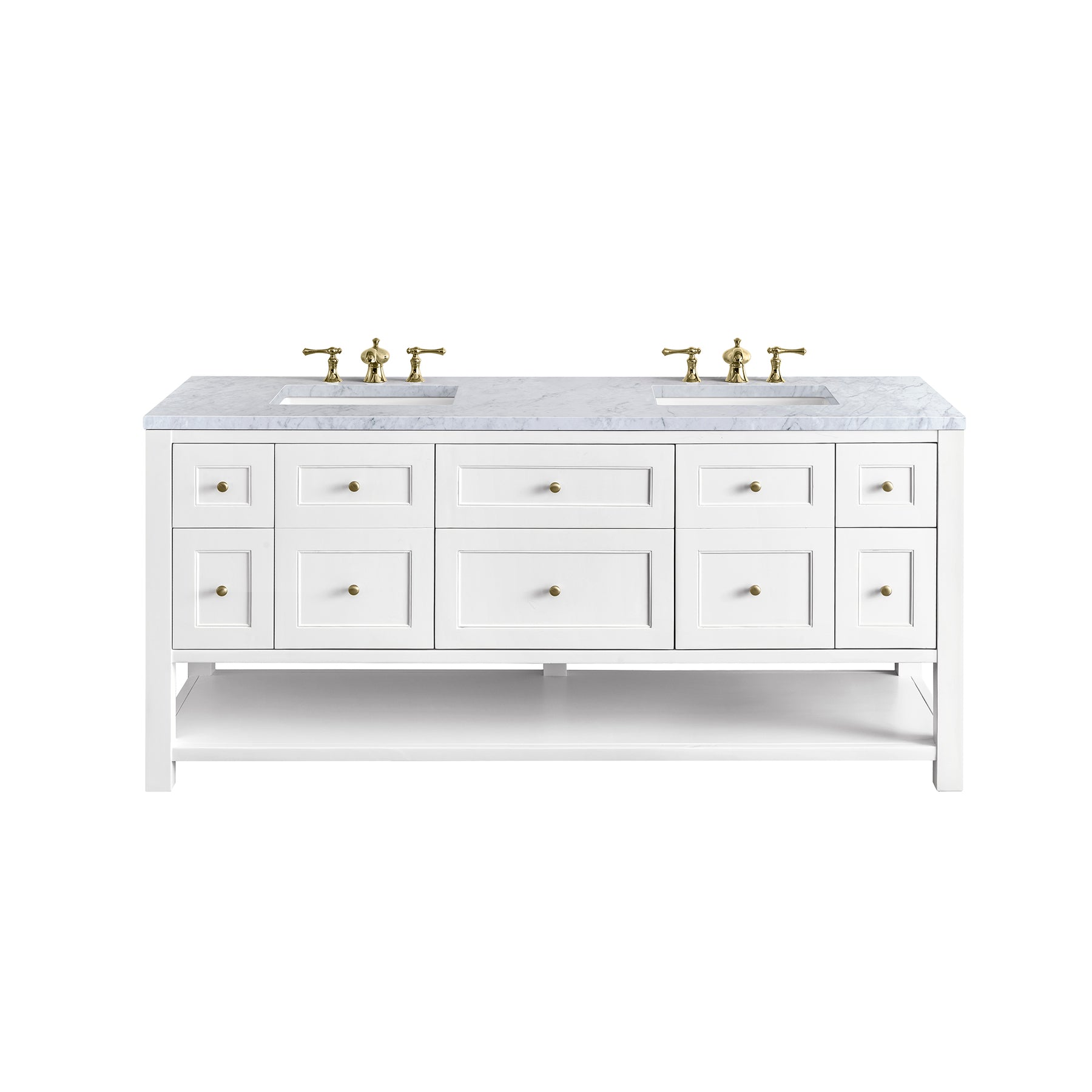 The Breckenridge 72" Double Vanity is a fresh take on traditional Mission furniture that easily transitions to Modern Farmhouse style with an air of understated sophistication. Champagne Brass knobs complement the Bright White finish, while the neatly inset door and drawer fronts lend a fresh appeal to this clean-lined classic. Two single-door cabinets open to reveal interior shelves equipped with a convenient built-in USB/120V power outlet. This console-style vanity also features six full-extension drawers and an open lower shelf for additional storage. A classic Carrara Marble top with undermount sinks completes the look.