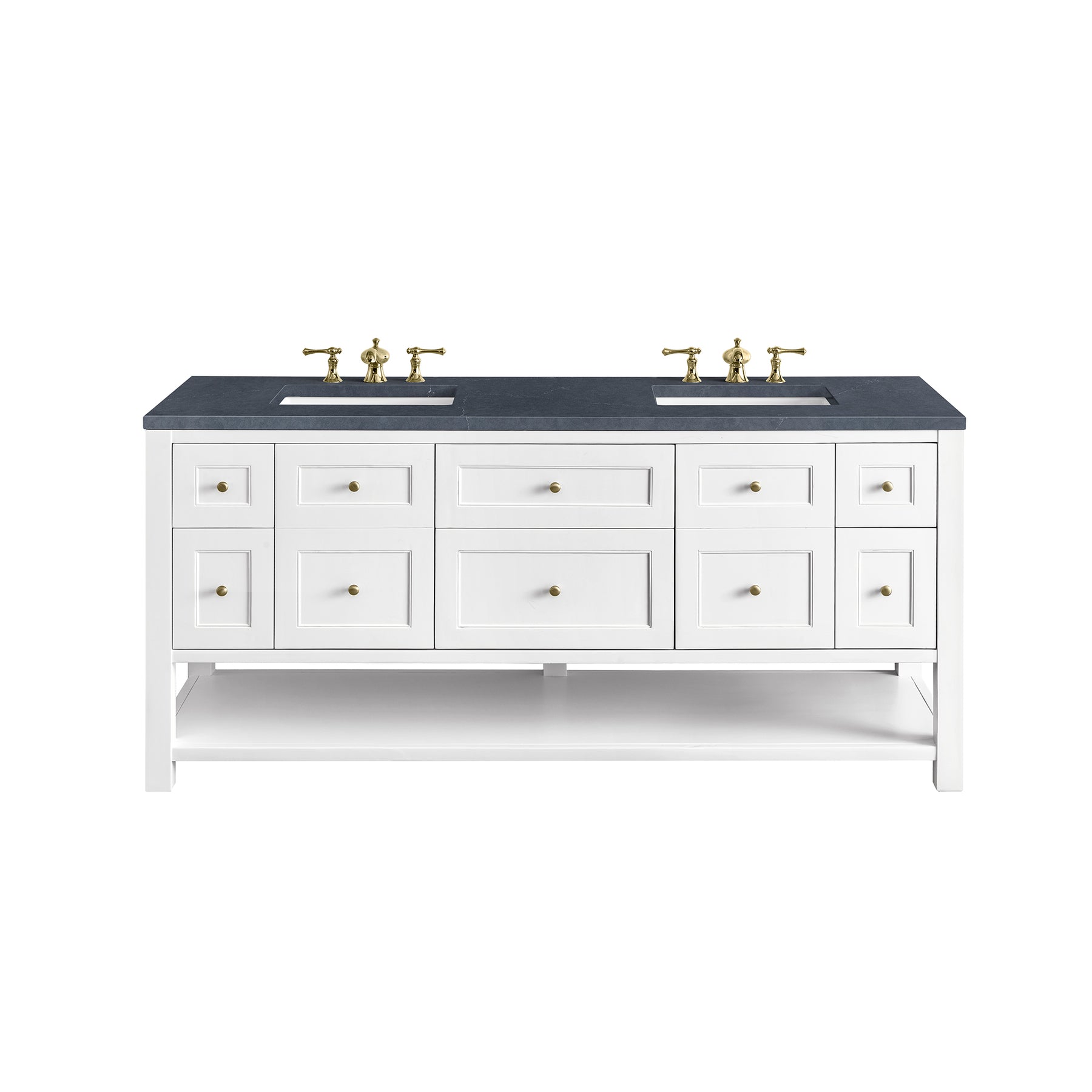 The Breckenridge 72" Double Vanity is a fresh take on traditional Mission furniture that easily transitions to Modern Farmhouse style with an air of understated sophistication. Champagne Brass knobs complement the Bright White finish, while the neatly inset door and drawer fronts lend a fresh appeal to this clean-lined classic. Two single-door cabinets open to reveal interior shelves equipped with a convenient built-in USB/120V power outlet. This console-style vanity also features six full-extension drawers and an open lower shelf for additional storage. A suede-finished Charcoal Soapstone Silestone top with undermount sinks completes the look.