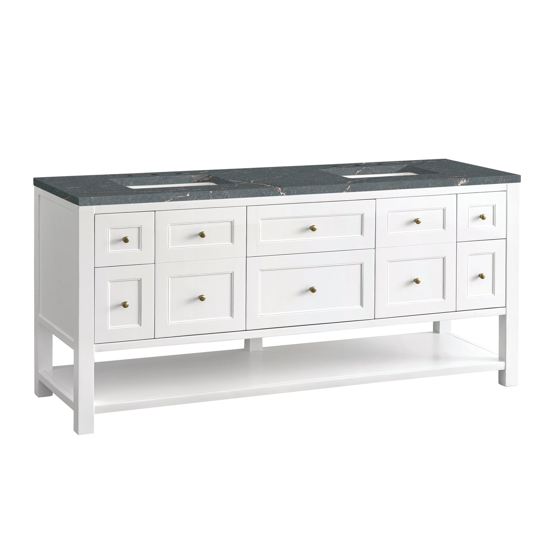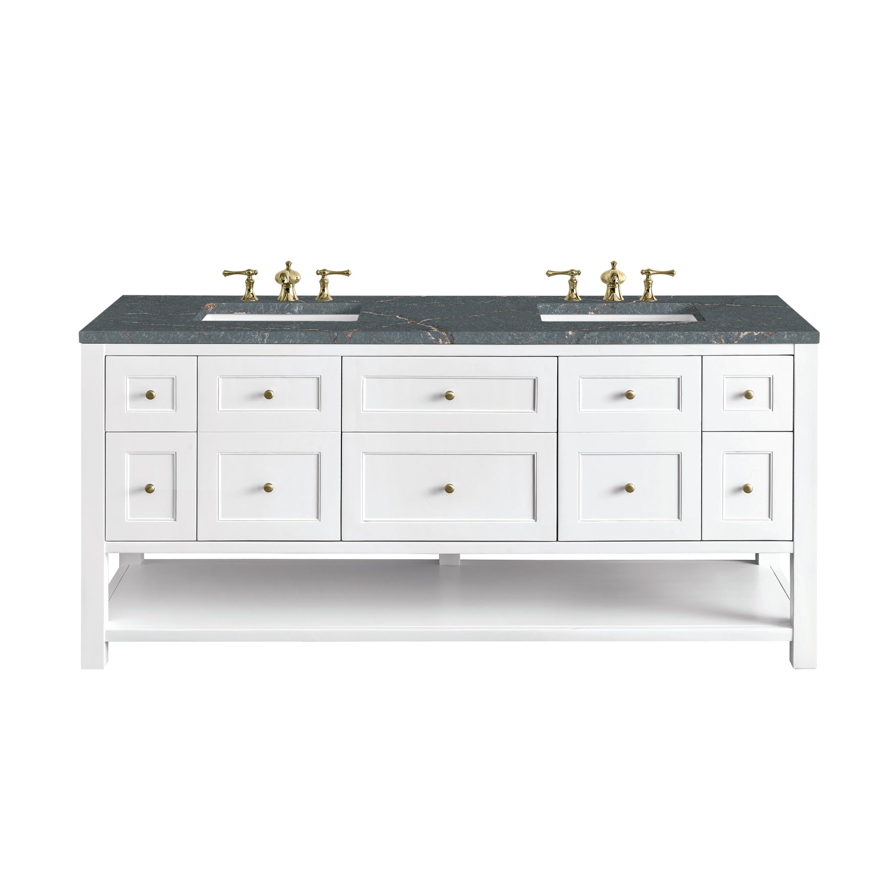 The Breckenridge 72" Double Vanity by James Martin Vanities is a fresh take on traditional Mission furniture that easily transitions to Modern Farmhouse style with an air of understated sophistication. Champagne Brass knobs complement the Bright White finish, while the neatly inset door and drawer fronts lend a fresh appeal to this clean-lined classic. Two single-door cabinets open to reveal interior shelves equipped with a convenient built-in USB/120V power outlet. This console-style vanity also features six full-extension drawers and an open lower shelf for additional storage. A gorgeous Parisien Bleu Silestone® top with undermount sinks completes the look.