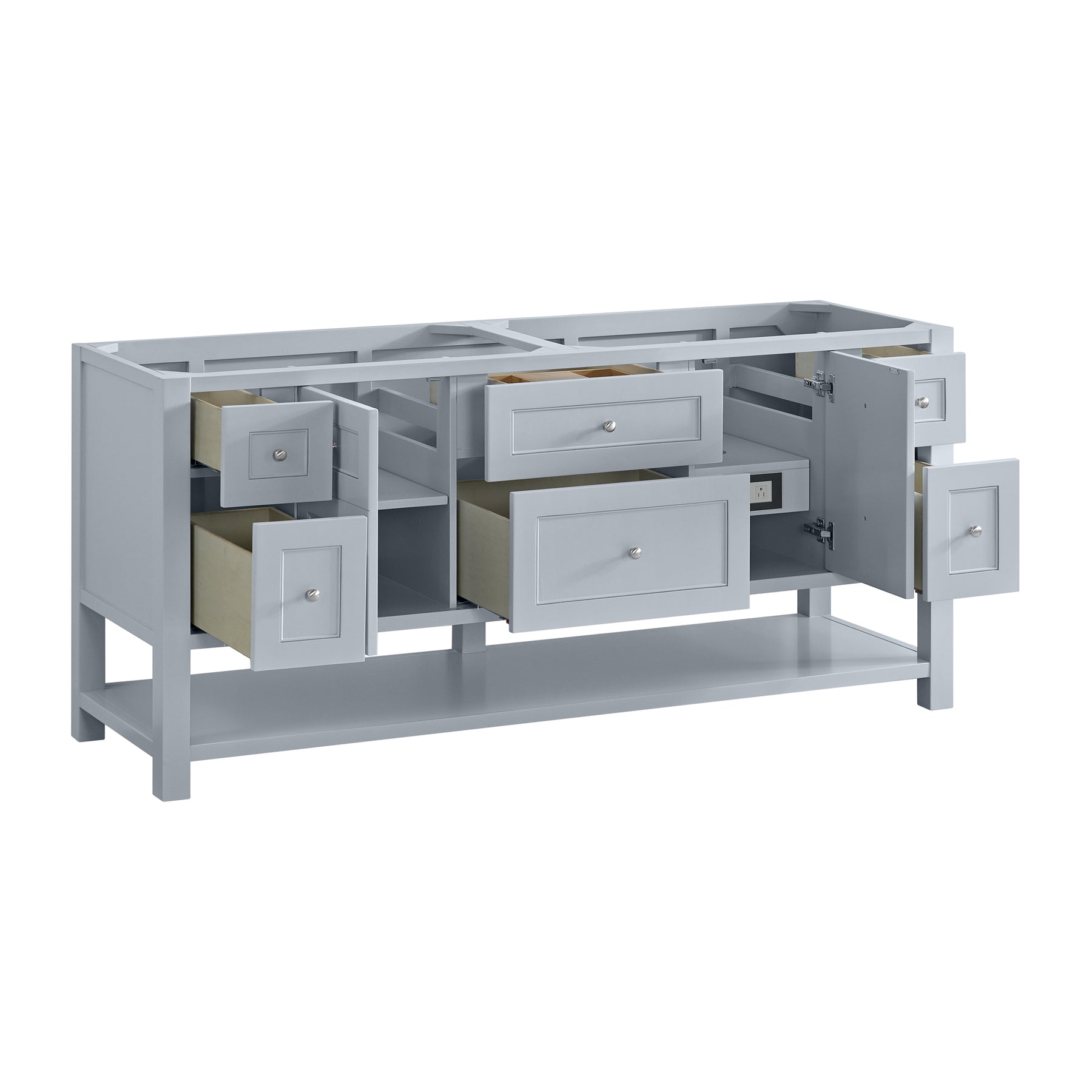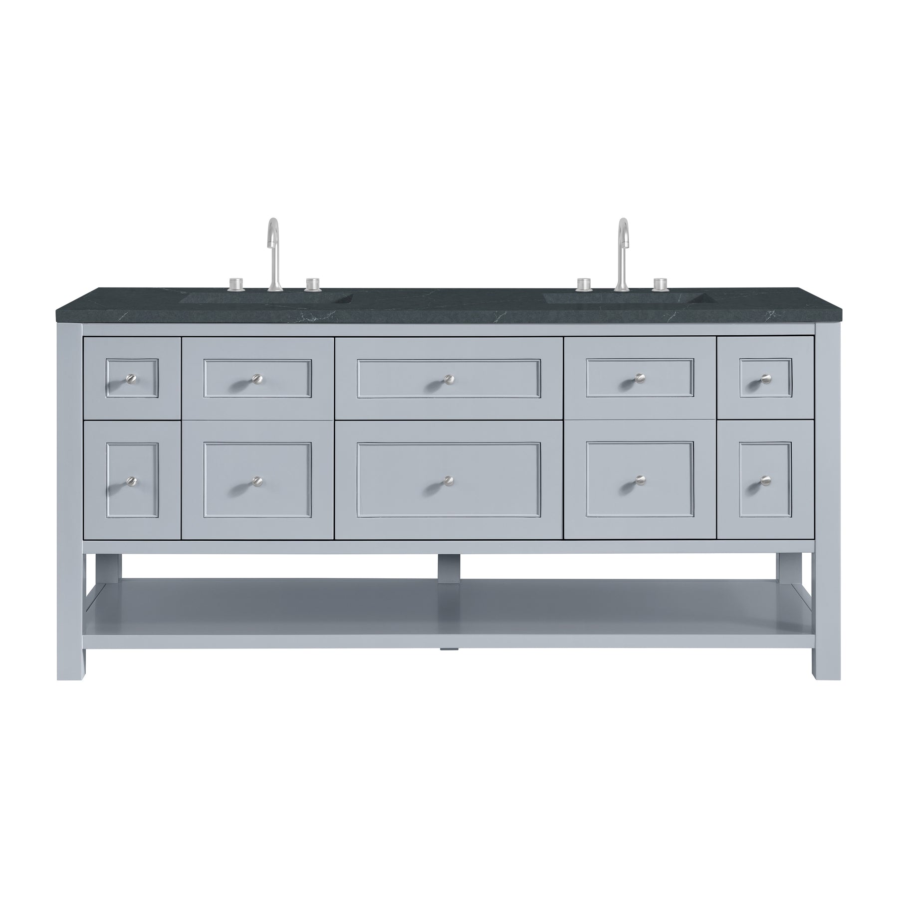 The Breckenridge 72" Double Vanity is a fresh take on traditional Mission furniture that easily transitions to Modern Farmhouse style with an air of understated sophistication. Satin Nickel knobs complement the Serenity Blue finish, while the neatly inset door and drawer fronts lend a fresh appeal to this clean-lined classic. Two single-door cabinets open to reveal interior shelves equipped with a convenient built-in USB/120V power outlet. This console-style vanity also features six full-extension drawers and an open lower shelf for additional storage. A suede-finished Charcoal Soapstone Silestone top with undermount sinks completes the look.