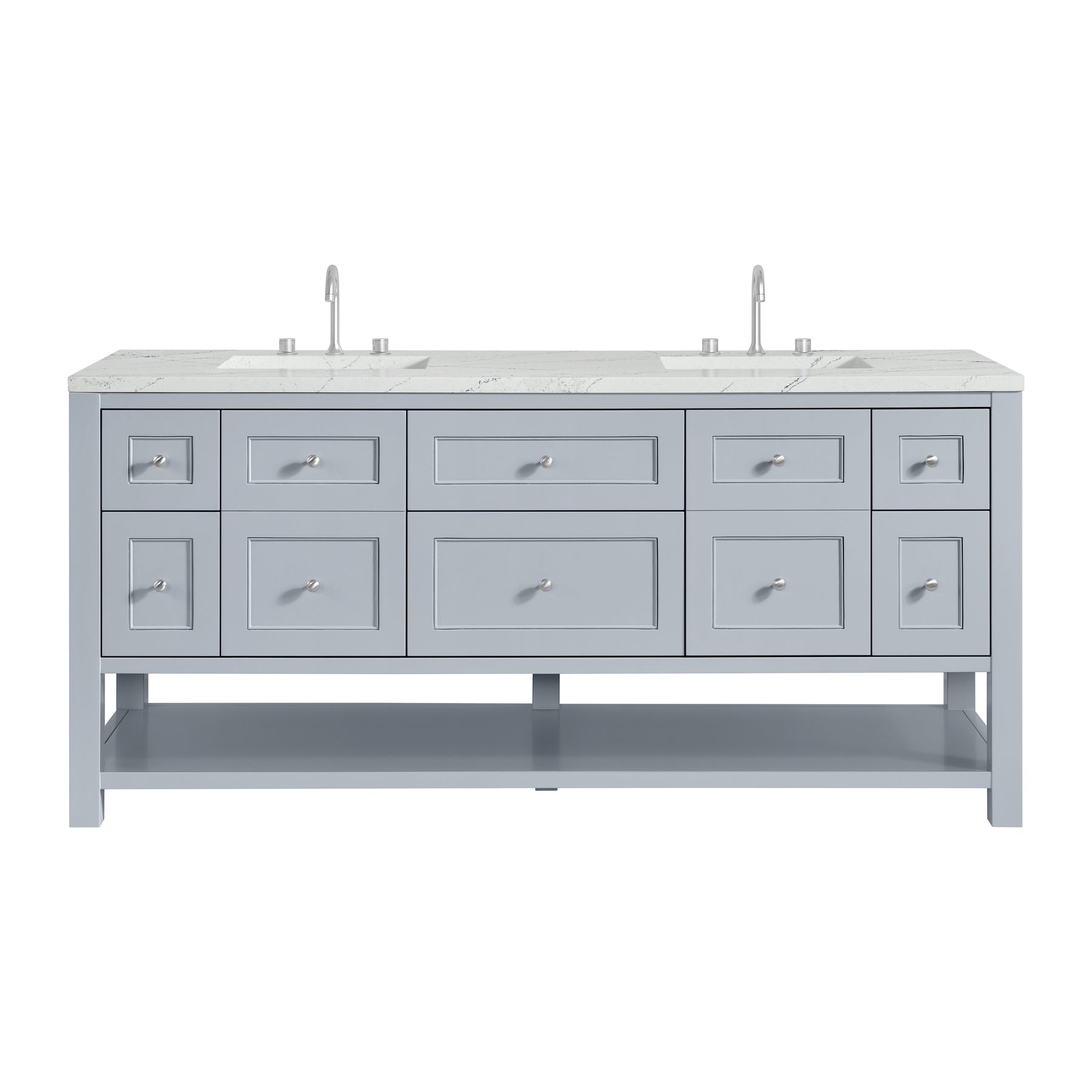 The Breckenridge 72" Double Vanity by James Martin Vanities is a fresh take on traditional Mission furniture that easily transitions to Modern Farmhouse style with an air of understated sophistication. Satin Nickel knobs complement the Serenity Blue finish, while the neatly inset door and drawer fronts lend a fresh appeal to this clean-lined classic. Two single-door cabinets open to reveal interior shelves equipped with a convenient built-in USB/120V power outlet. This console-style vanity also features six full-extension drawers and an open lower shelf for additional storage. A stunning Ethereal Noctis Silestone® top with undermount sinks completes the look.