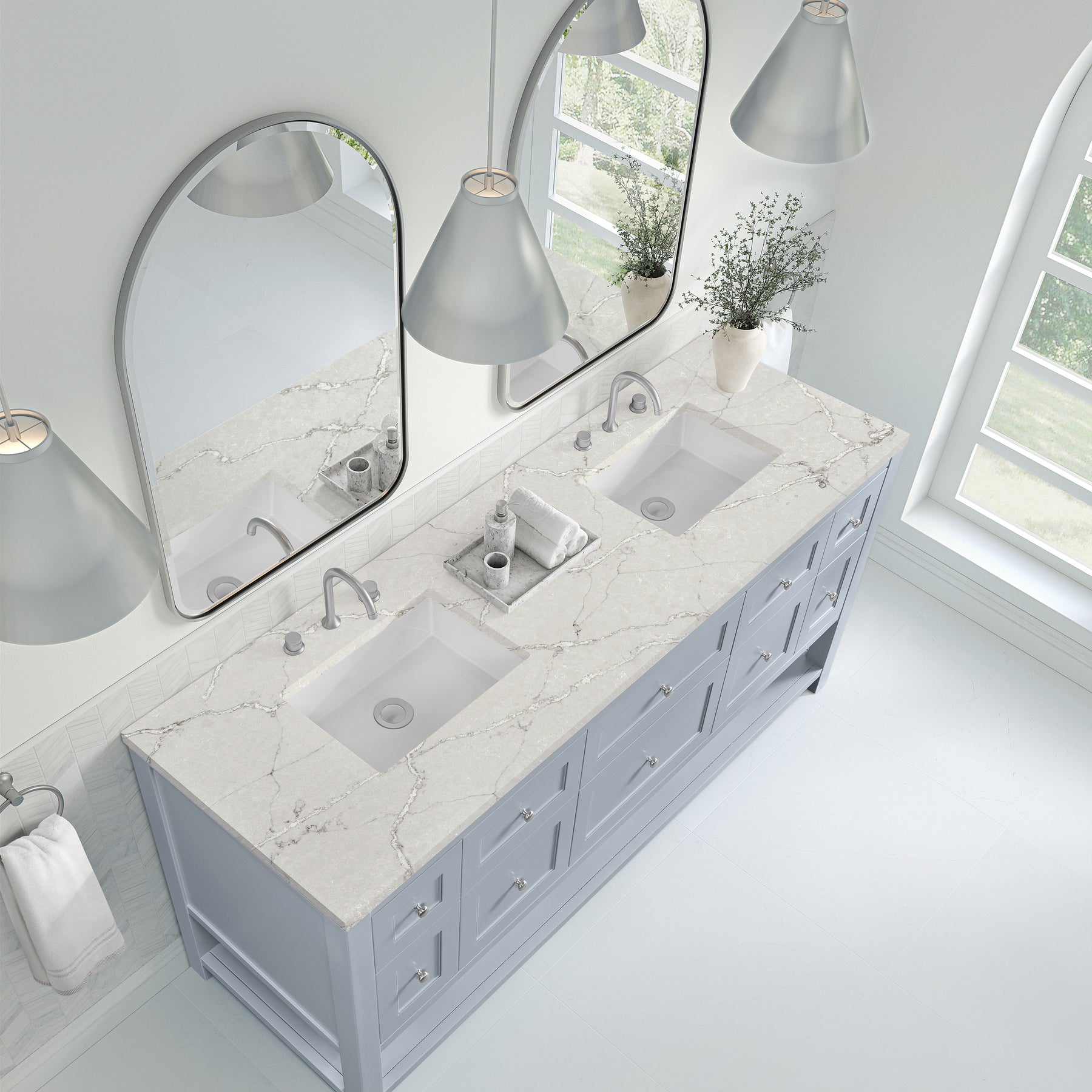 The Breckenridge 72" Double Vanity by James Martin Vanities is a fresh take on traditional Mission furniture that easily transitions to Modern Farmhouse style with an air of understated sophistication. Satin Nickel knobs complement the Serenity Blue finish, while the neatly inset door and drawer fronts lend a fresh appeal to this clean-lined classic. Two single-door cabinets open to reveal interior shelves equipped with a convenient built-in USB/120V power outlet. This console-style vanity also features six full-extension drawers and an open lower shelf for additional storage. A beautiful Victorian Silver Silestone® top with undermount sinks completes the look.