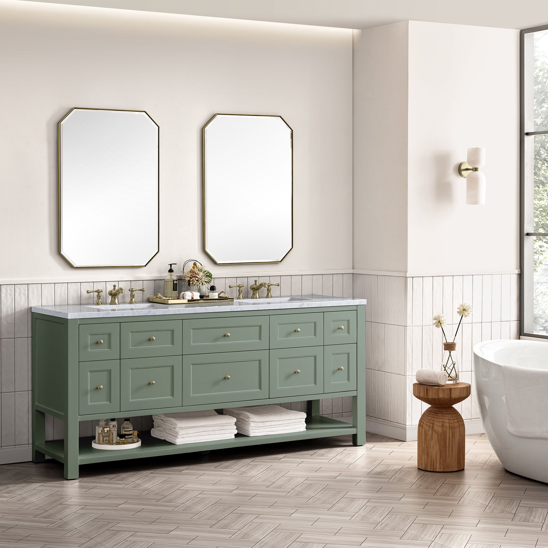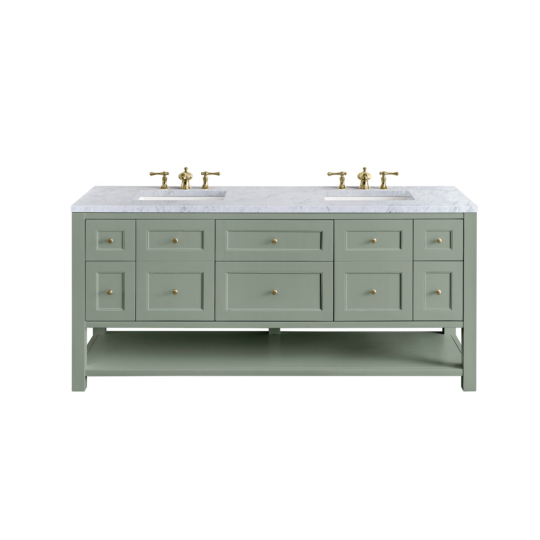 The Breckenridge 72" Double Vanity is a fresh take on traditional Mission furniture that easily transitions to Modern Farmhouse style with an air of understated sophistication. Champagne Brass knobs complement the Smokey Celadon finish, while the neatly inset door and drawer fronts lend a fresh appeal to this clean-lined classic. Two single-door cabinets open to reveal interior shelves equipped with a convenient built-in USB/120V power outlet. This console-style vanity also features six full-extension drawers and an open lower shelf for additional storage. A classic Carrara Marble top with undermount sinks completes the look.
