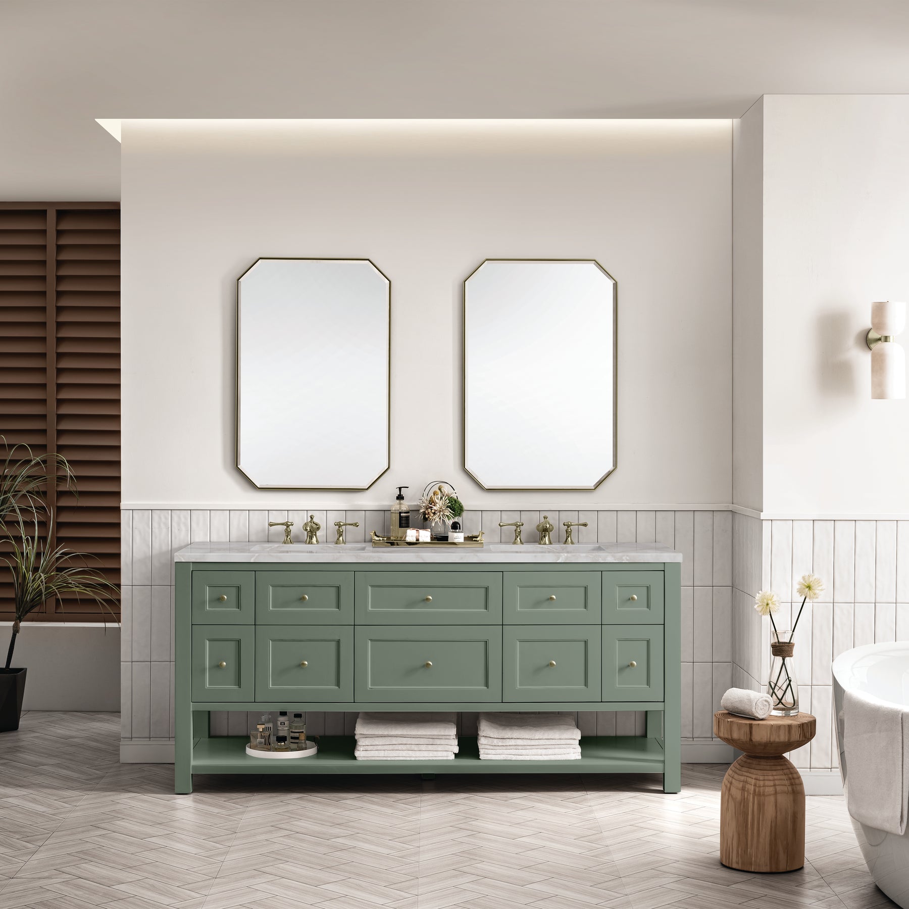 The Breckenridge 72" Double Vanity is a fresh take on traditional Mission furniture that easily transitions to Modern Farmhouse style with an air of understated sophistication. Champagne Brass knobs complement the Smokey Celadon finish, while the neatly inset door and drawer fronts lend a fresh appeal to this clean-lined classic. Two single-door cabinets open to reveal interior shelves equipped with a convenient built-in USB/120V power outlet. This console-style vanity also features six full-extension drawers and an open lower shelf for additional storage. A beautiful Victorian Silver Silestone top with undermount sinks completes the look.