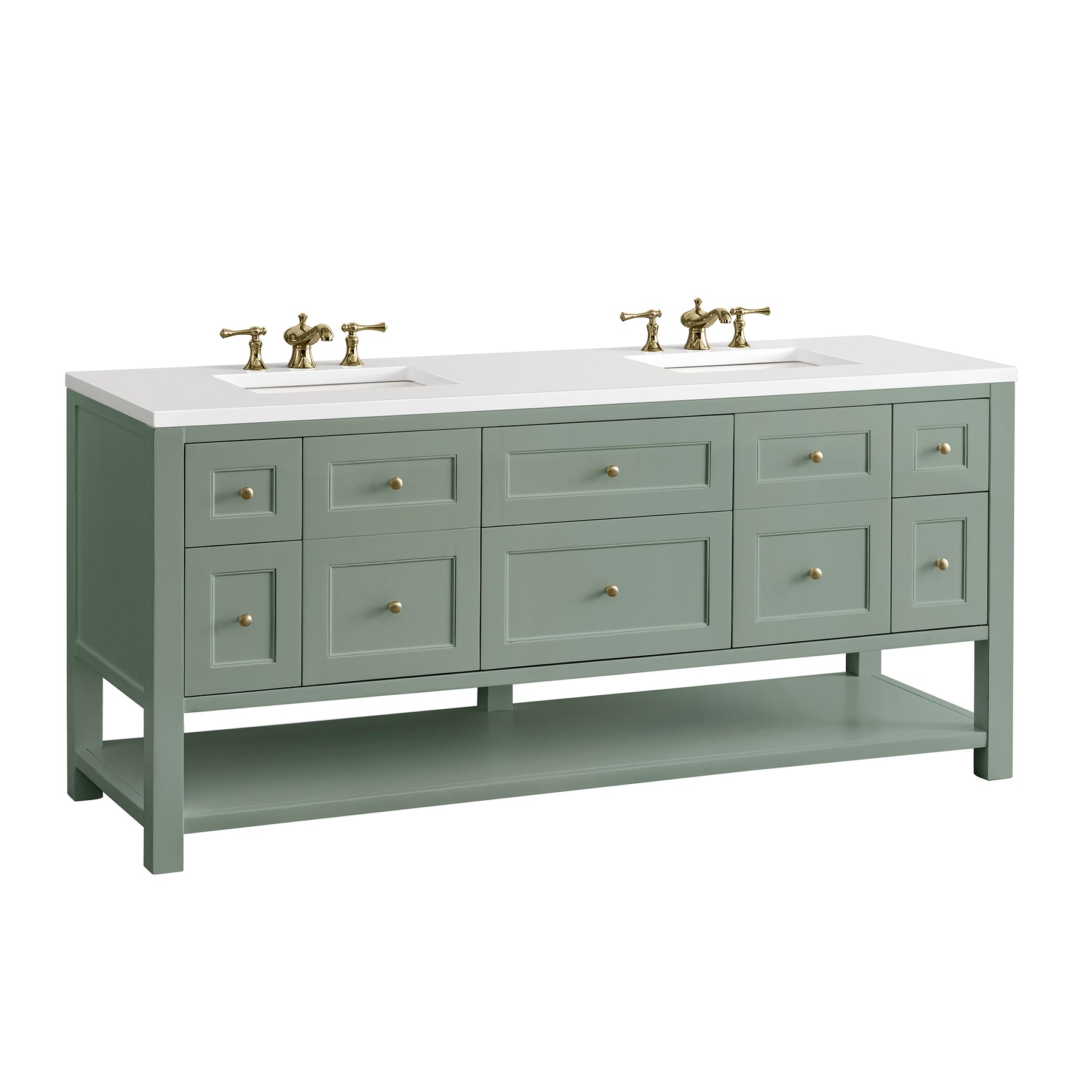 The Breckenridge 72" Double Vanity is a fresh take on traditional Mission furniture that easily transitions to Modern Farmhouse style with an air of understated sophistication. Champagne Brass knobs complement the Smokey Celadon finish, while the neatly inset door and drawer fronts lend a fresh appeal to this clean-lined classic. Two single-door cabinets open to reveal interior shelves equipped with a convenient built-in USB/120V power outlet. This console-style vanity also features six full-extension drawers and an open lower shelf for additional storage. A classic White Zeus Silestone top with undermount sinks completes the look.