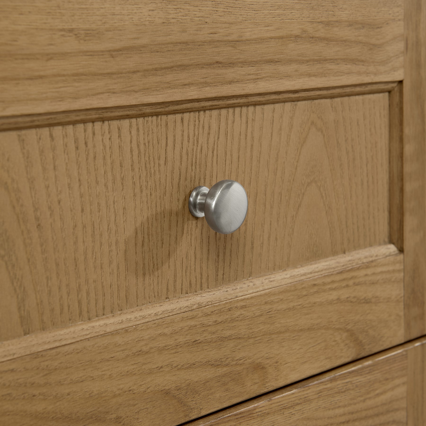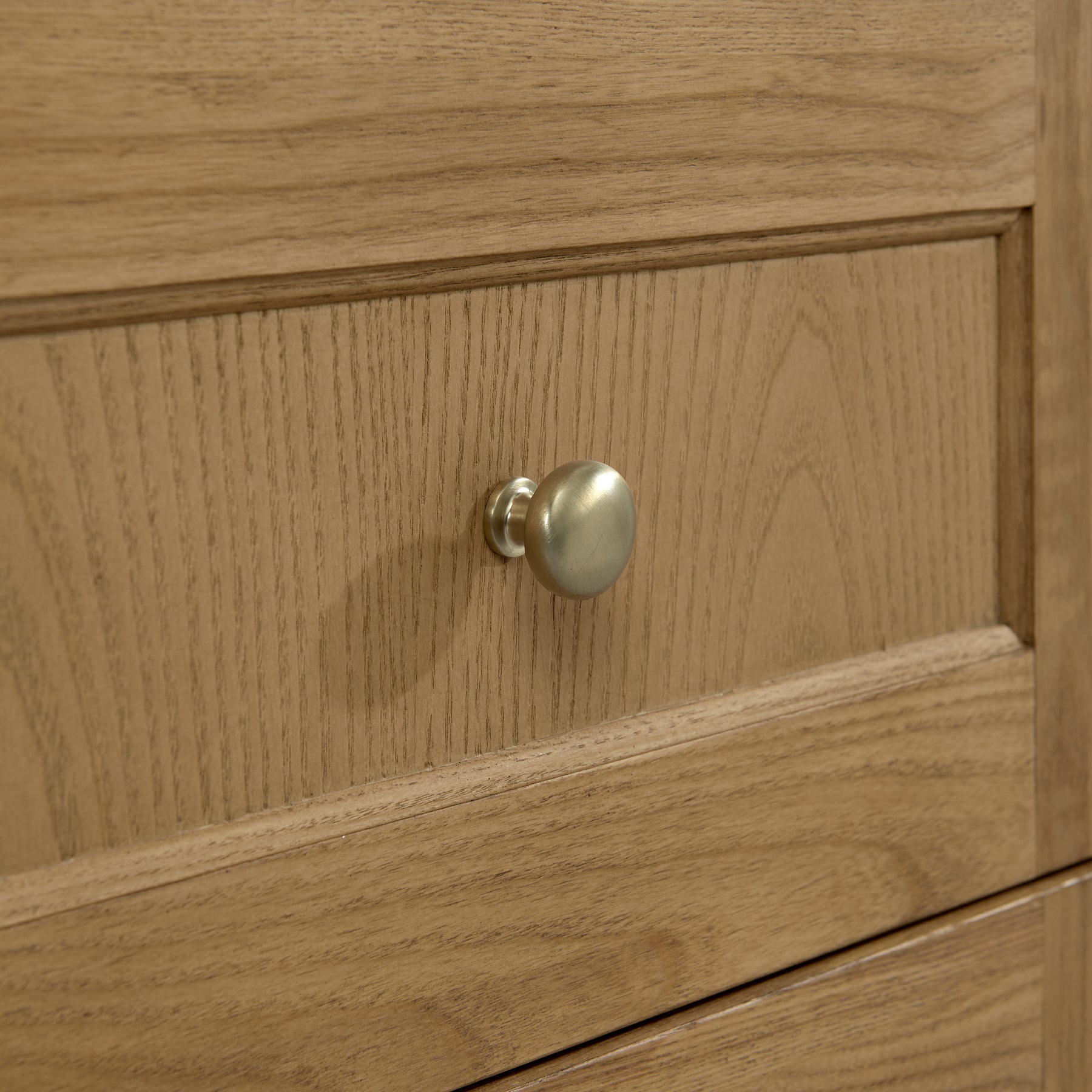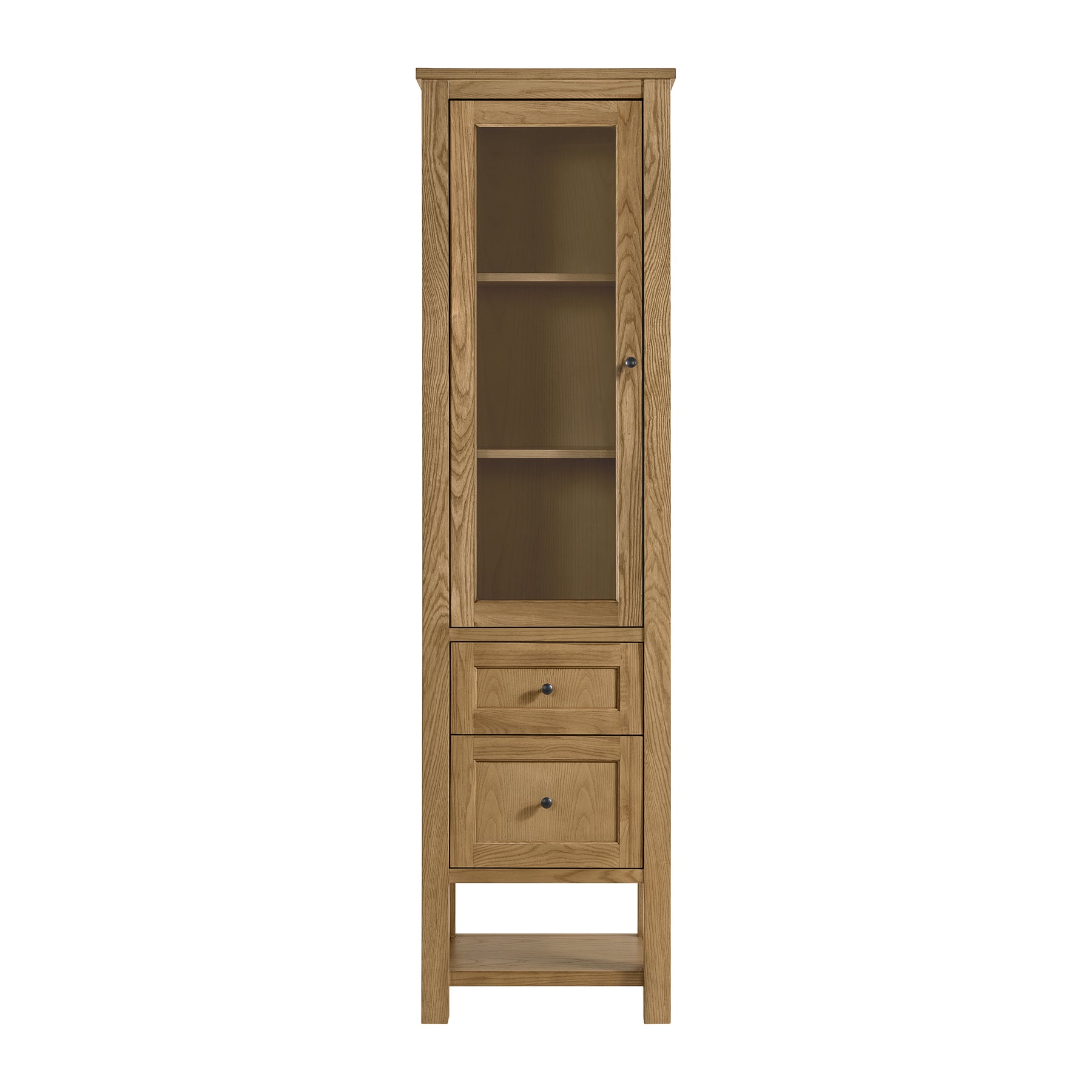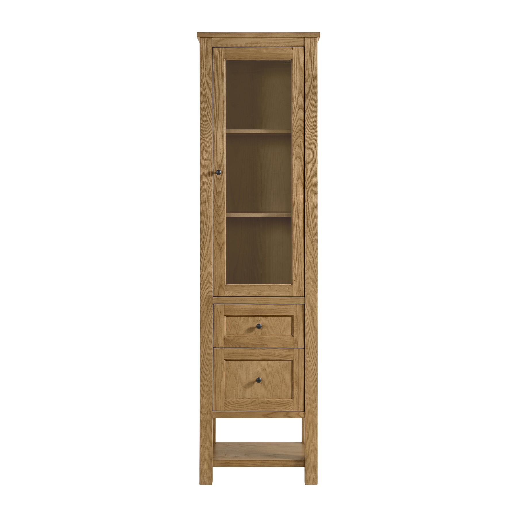 The Breckenridge 22" Linen Cabinet is a fresh take on traditional Mission furniture that easily transitions to Modern Farmhouse style with an air of understated sophistication. The neatly inset drawer fronts maintain the symmetry of the Shaker aesthetic and help highlight the beautiful wood grain of the Light Natural Oak finish. A single reversible door, allowing for left or right opening installation, is inset with premium clear glass and opens to two adjustable shelves where you can show off your bathroom essentials. Two full-extension drawers and an open lower shelf offer additional storage. Designed with both form and function in mind, the Breckenridge Linen Cabinet comes with all three hardware options for additional customization.