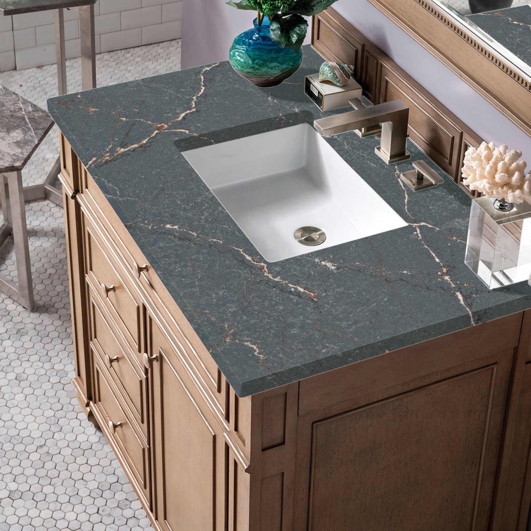 Detailed and distinctive, the Bristol 36” Single Vanity features recessed and raised picture frame molding. This single door cabinet opens to one shelf, and has three drawers, with the lower drawer being double height and the top drawer tip-out style. Gracefully supported by tulip-shaped legs, this vanity offers a mix of craftsmanship and functionality. This distinguished vanity is enhanced by the Parisien Bleu Silestone top, offering a deep bluish hue with broad and intricate neutral veins highlighted by fine coppery accents.