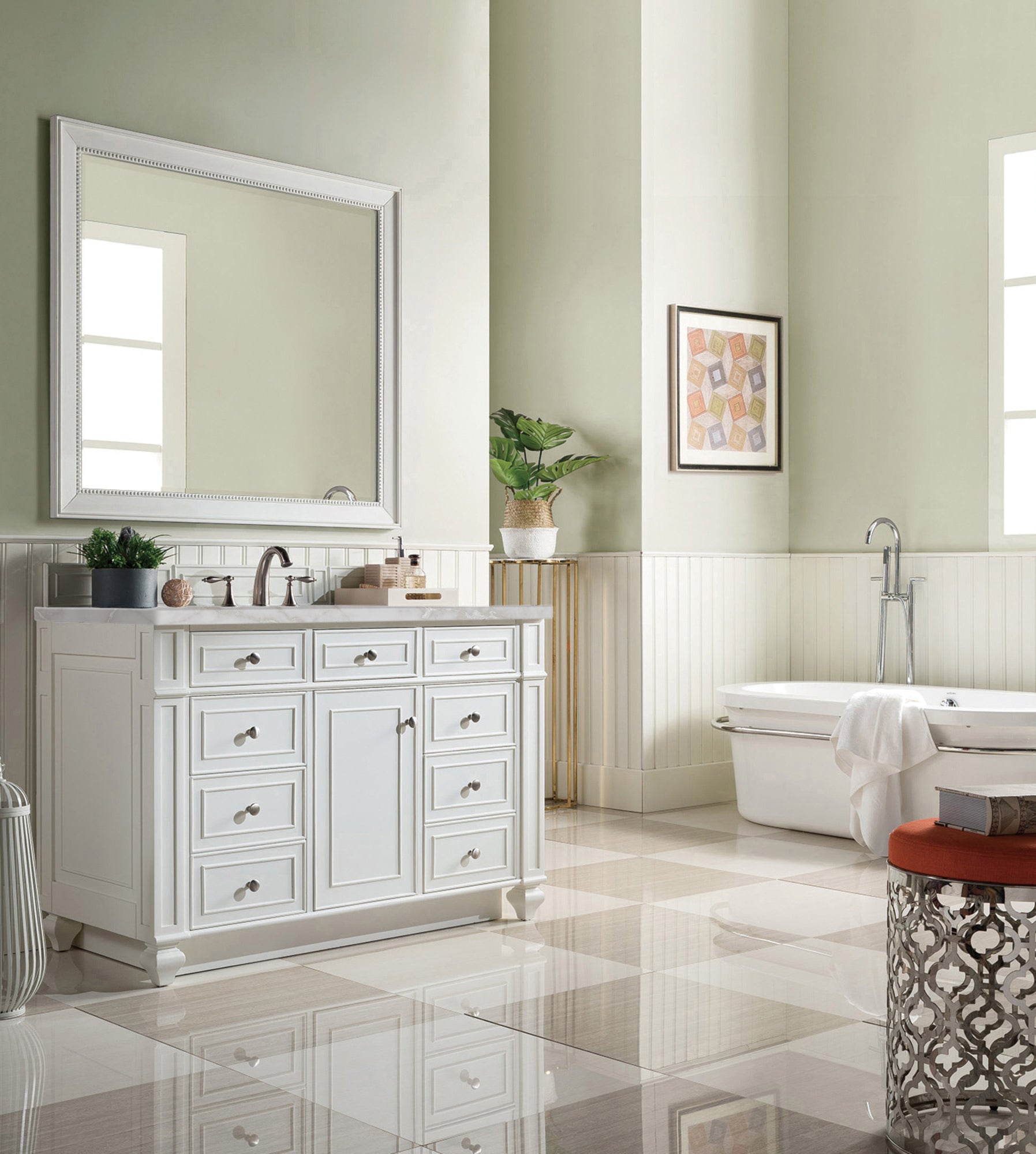 Detailed and distinctive, the Bristol 48” Single Vanity features recessed and raised picture frame molding. This single door cabinet has one door which opens to one shelf and seven drawers, lower drawers are "double height", top middle drawer is tip out style. This classic finish is accented by the neutral background of the Victorian Silver Silestone top, boasting champagne metallic accents which seamlessly complement warm and cool tones. Gracefully supported by tulip-shaped legs, this vanity offers a mix of craftsmanship and functionality.