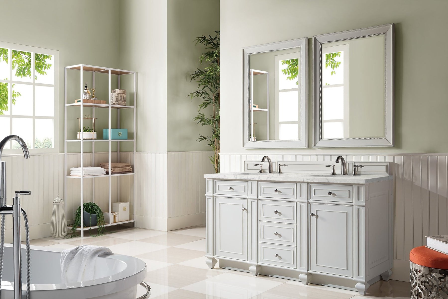 The Bristol 60" Bright White Double Vanity features a full plinth base, also known as a toe kick or pedestal base. This wraparound base allows for quick clean ups. This vanity is complimented by Satin Nickel door and drawer pulls, along with an optional wood backsplash. The look is completed with a 3 CM eased edge Eternal Jasmine Pearl Silestone top and one white ceramic rectangular sink.