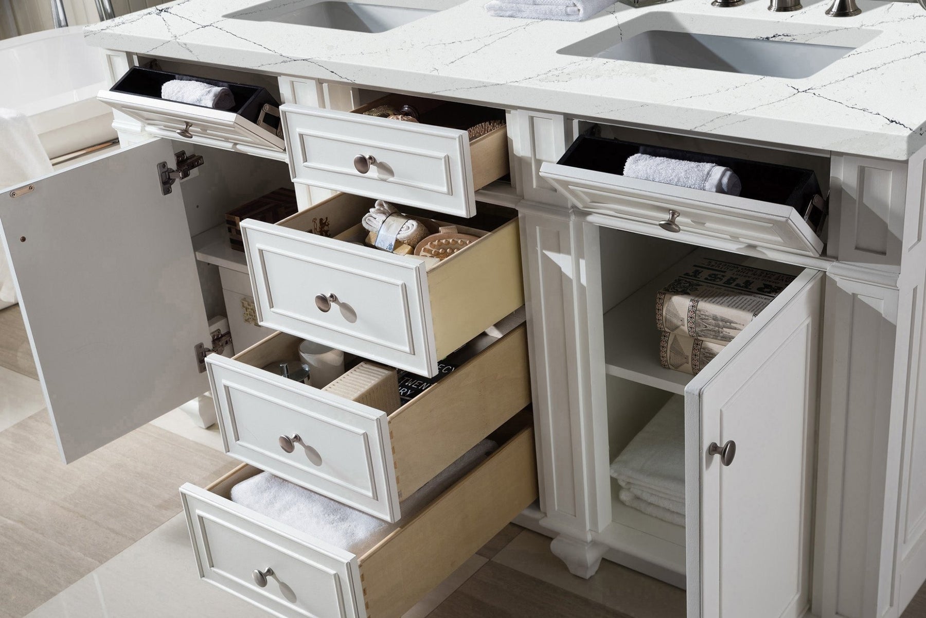 The Bristol 60" Bright White Double Vanity by James Martin Vanities is a perfect blend of elegance and practicality for your bathroom. This detailed and distinctive vanity is designed with ample storage, featuring two top-row tip-out drawers, three full-extension aluminum laminate-lined drawers, and two doors that open to reveal an internal shelf. Satin Nickel door and drawer pulls add a touch of modern elegance, while the tulip legs optional wood backsplash provides an additional decorative element. The cabinet is topped with a 3 CM Silestone® Ethereal Noctis countertop, with white porcelain undermount rectangular sinks.