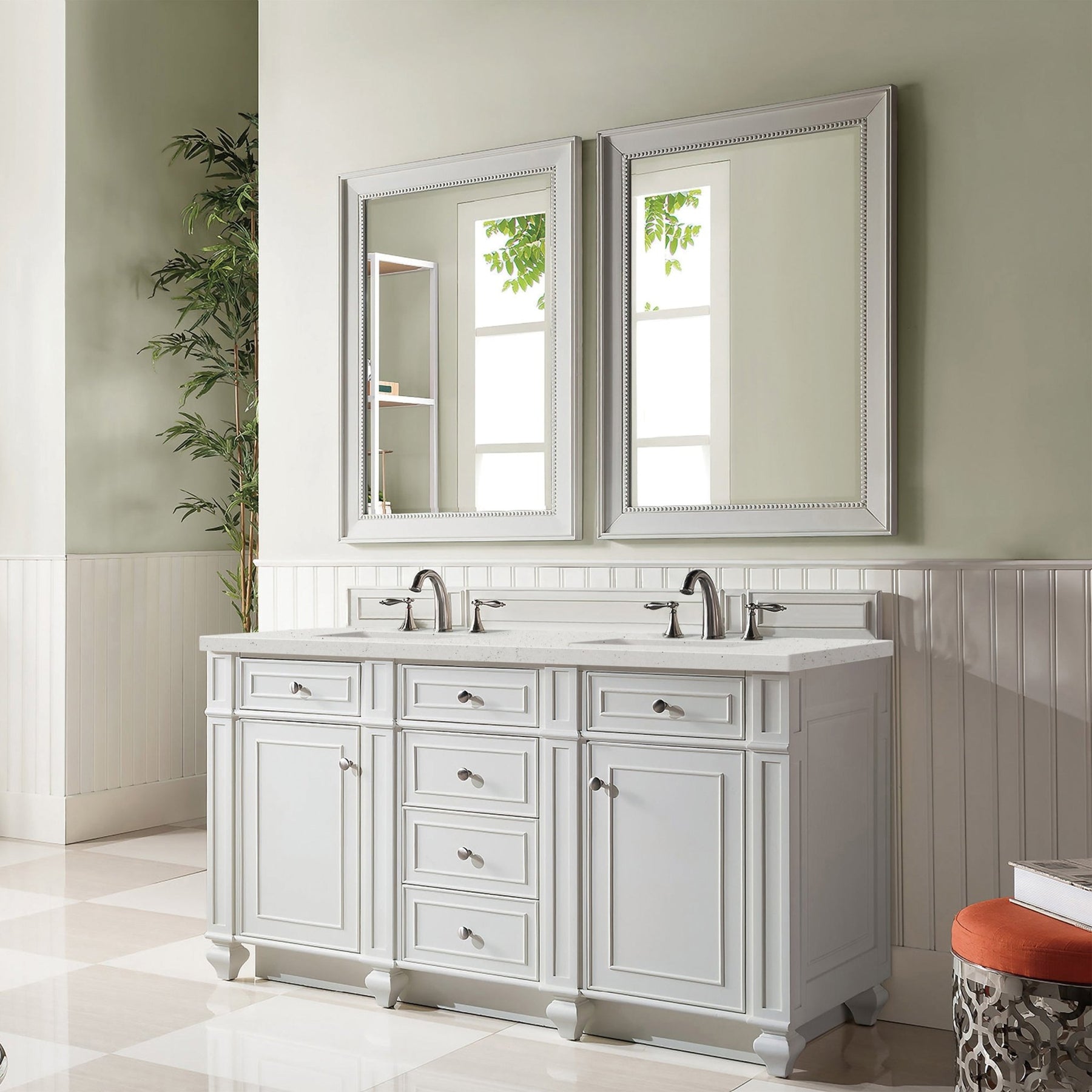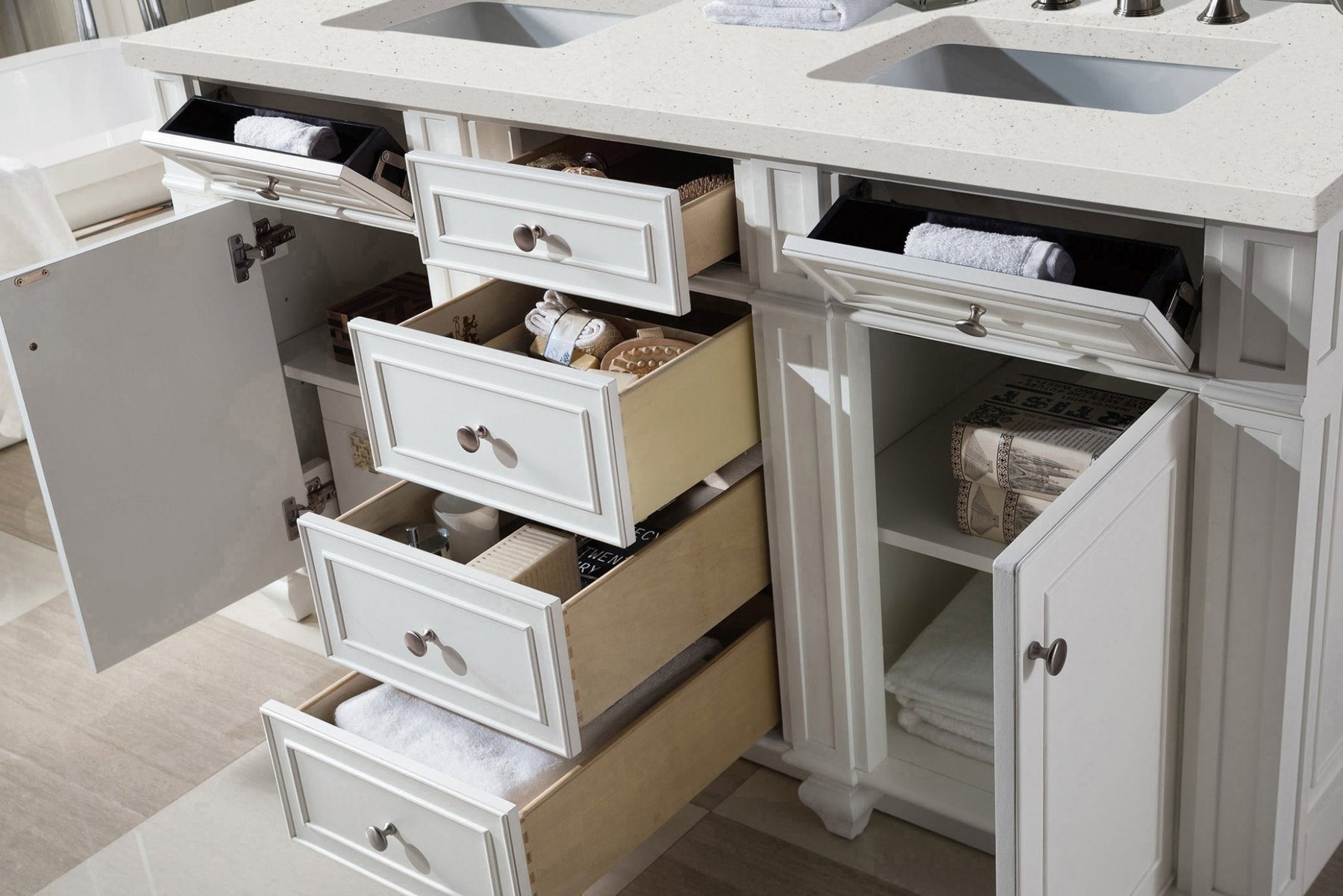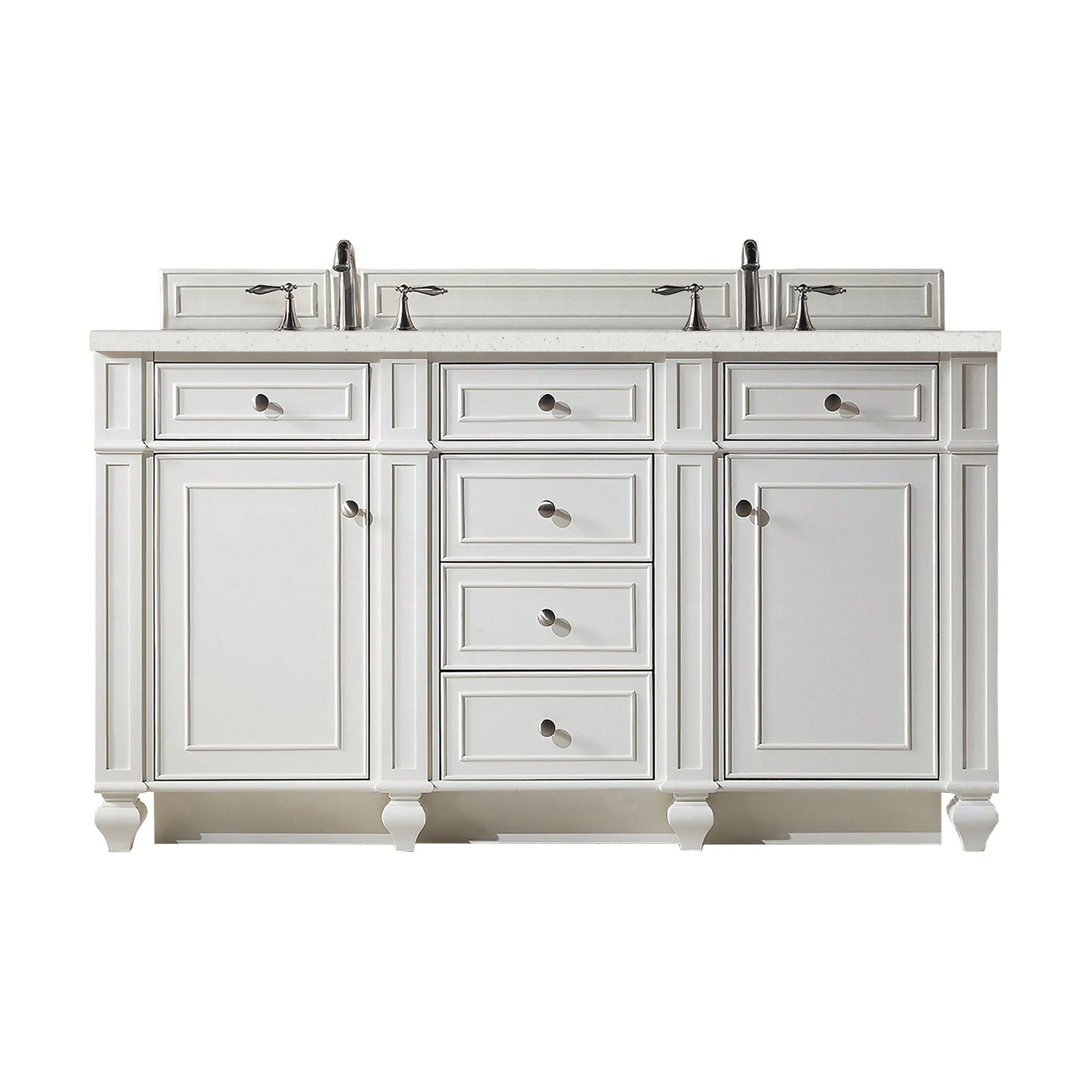 Detailed and distinctive, the Bristol 60” Double Vanity in Bright White features recessed and raised picture frame molding. This two door cabinet with one shelf and seven drawers, lower drawers are "double height", top middle drawer is tip out style. Gracefully supported by tulip-shaped legs, this vanity offers a mix of craftsmanship and functionality. Completed with a Lime Delight Silestone top which lends warm, textured beige tones, the Bristol vanity can complement a variety of decors and is a sophisticated vanity solution for your small bathroom.
