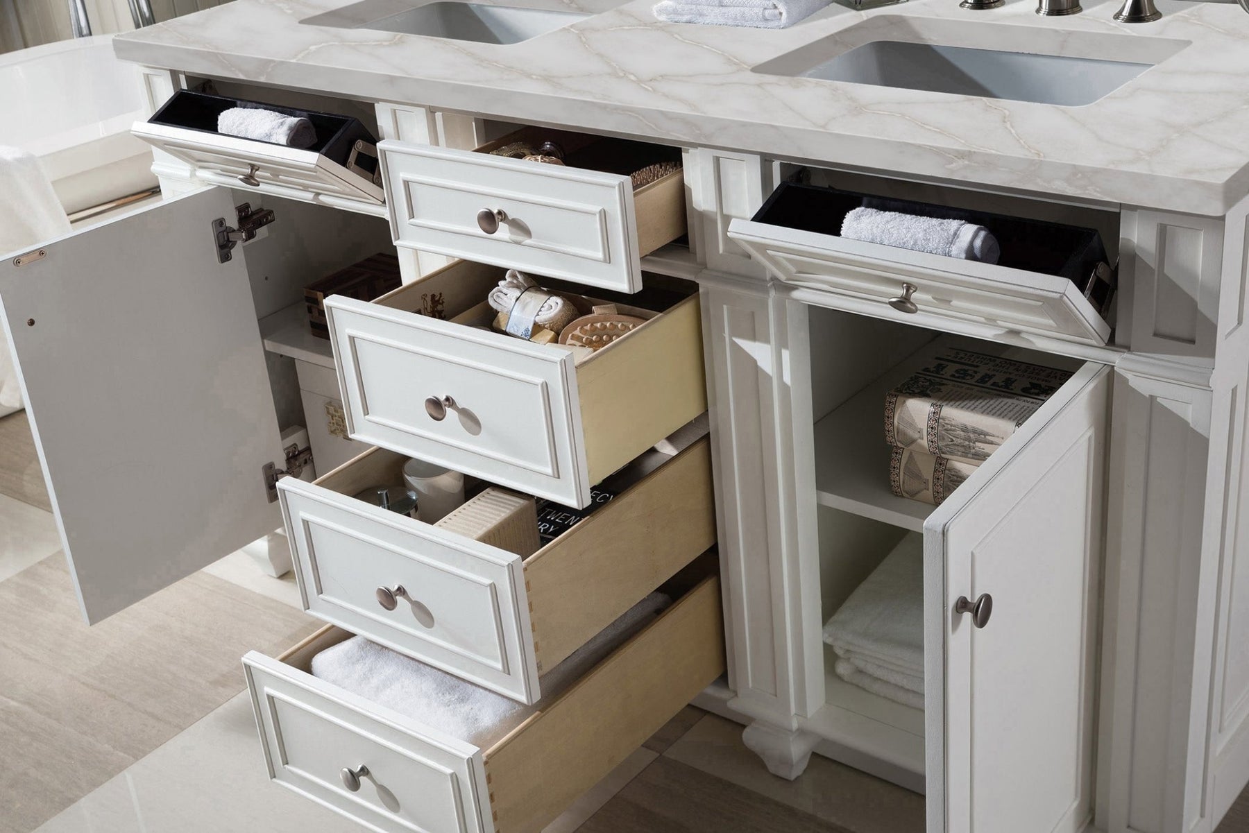 Detailed and distinctive, the Bristol 60” Double Vanity in Bright White features recessed and raised picture frame molding. This two door cabinet with one shelf and seven drawers, lower drawers are "double height", top middle drawer is tip out style. This classic finish is accented by the neutral background of the Victorian Silver Silestone top, boasting champagne metallic accents which seamlessly complement warm and cool tones. Gracefully supported by tulip-shaped legs, this vanity offers a mix of craftsmanship and functionality.