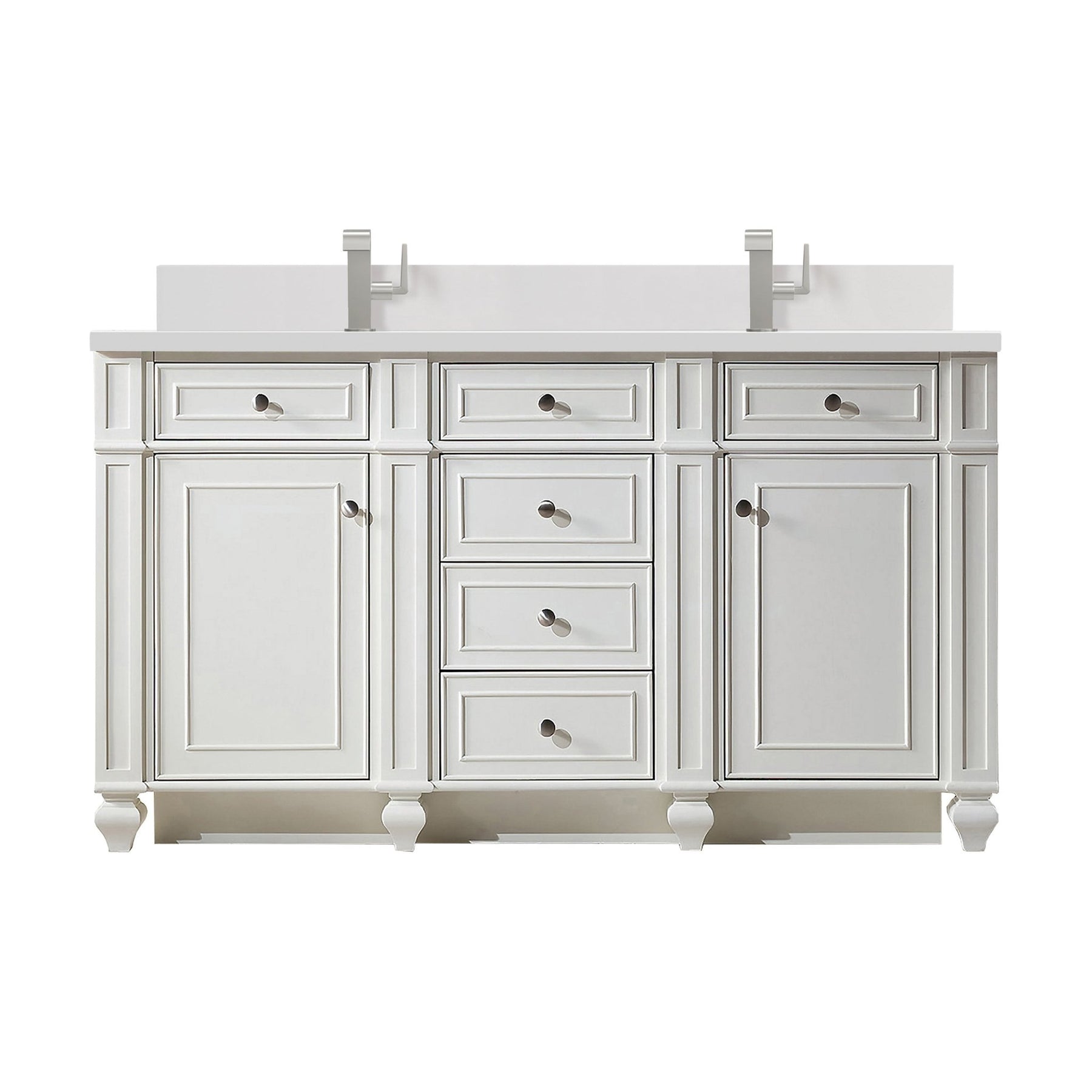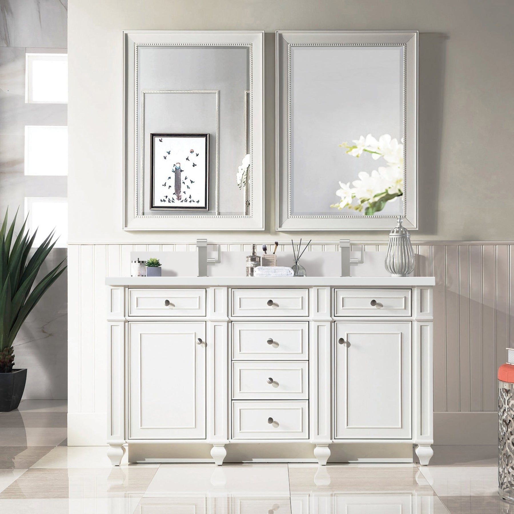 Detailed and distinctive, the Bristol 60” Double Vanity in Bright White features recessed and raised picture frame molding. This two door cabinet with one shelf and seven drawers, lower drawers are "double height", top middle drawer is tip out style. The timeless, White Zeus Silestone top and backsplash provides a contemporary touch, or choose to use the top with included wood backsplash. Gracefully supported by tulip-shaped legs, this vanity offers a mix of craftsmanship and functionality.