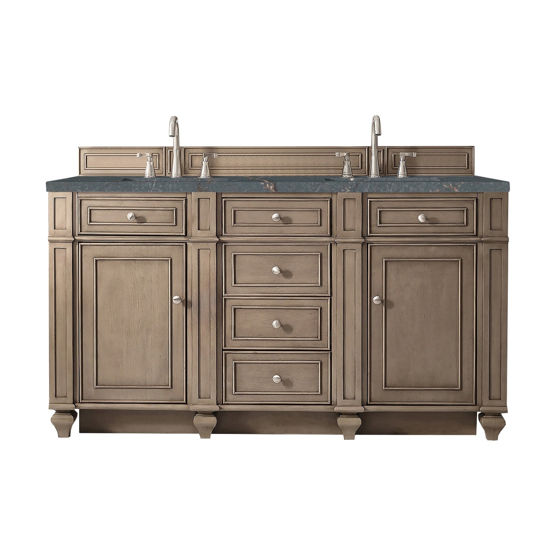 The Bristol 60" Whitewashed Walnut Double Vanity by James Martin Vanities is a perfect blend of elegance and practicality for your bathroom. This detailed and distinctive vanity is designed with ample storage, featuring two top-row tip-out drawers, three full-extension aluminum laminate-lined drawers, and two doors that open to reveal an internal shelf. Satin Nickel door and drawer pulls add a touch of modern elegance, while the tulip legs optional wood backsplash provides an additional decorative element. The cabinet is topped with a 3 CM Silestone® Parisien Bleu countertop, with white porcelain undermount rectangular sinks.