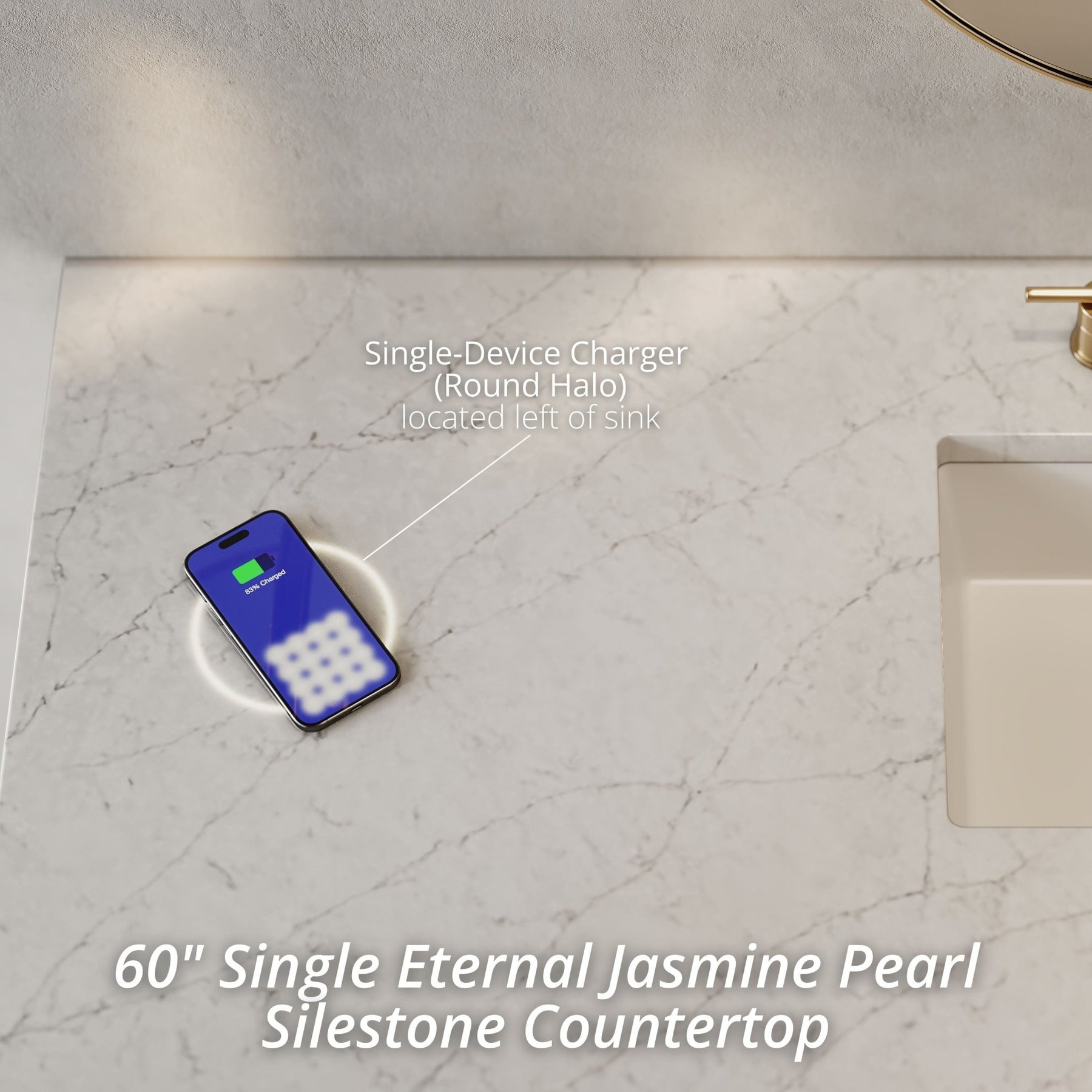 This unit is enabled with FreePower wireless charging; featuring a single-device charger seamlessly embedded into the countertop, indicated by a light-up halo to the left of the sink. Designed for modern living, FreePower offers convenient, integrated, wireless charging when and where you need it.