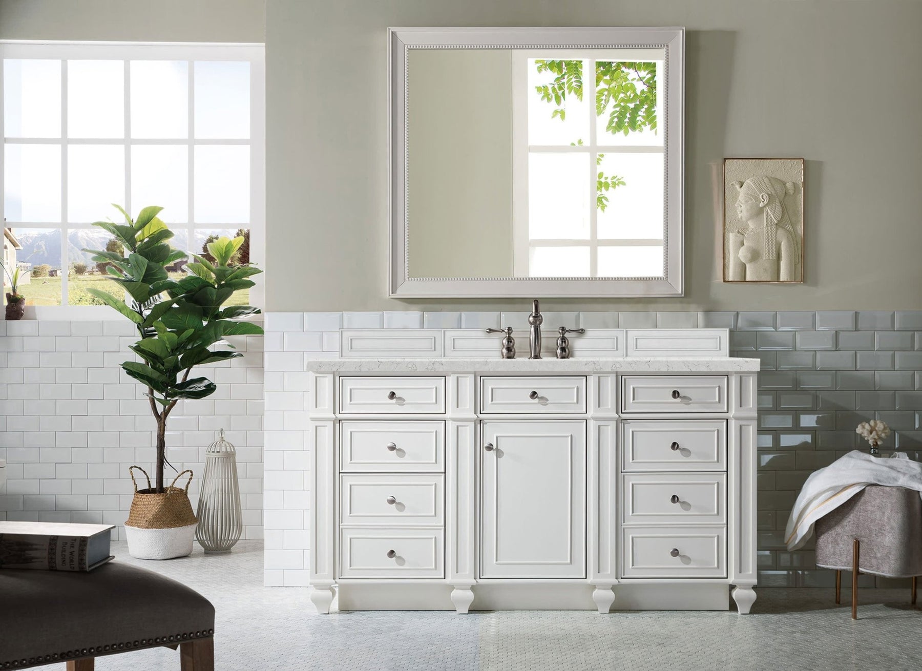 The Bristol 60" Bright White Single Vanity by James Martin Vanities is a perfect blend of elegance and practicality for your bathroom. This detailed and distinctive vanity is designed with ample storage, featuring one top-row tip-out drawer, six full-extension aluminum laminate-lined drawers, and one door that opens to reveal an internal shelf. Satin Nickel door and drawer pulls add a touch of modern elegance, while the tulip legs optional wood backsplash provides an additional decorative element. The cabinet is topped with a 3 CM Silestone® Eternal Jasmine Pearl countertop, with a white porcelain undermount rectangular sink.