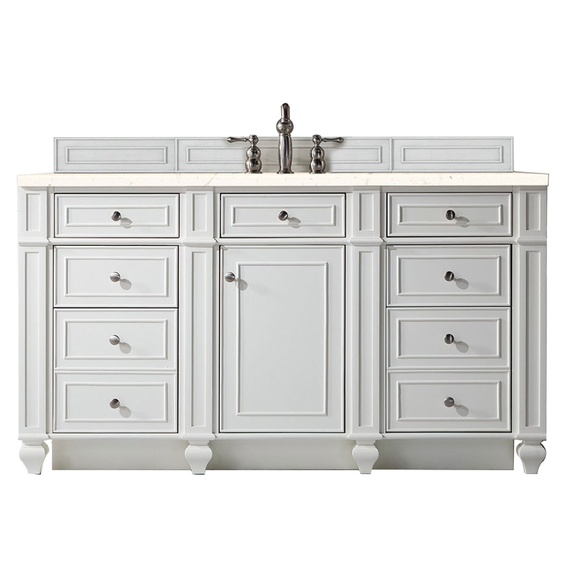 The Bristol 60" Bright White Single Vanity features a full plinth base, also known as a toe kick or pedestal base. This wraparound base allows for quick clean ups. This vanity is complimented by Satin Nickel door and drawer pulls, along with an optional wood backsplash. The look is completed with a 3 CM eased edge Eternal Marfil Silestone top and one white ceramic rectangular sink.