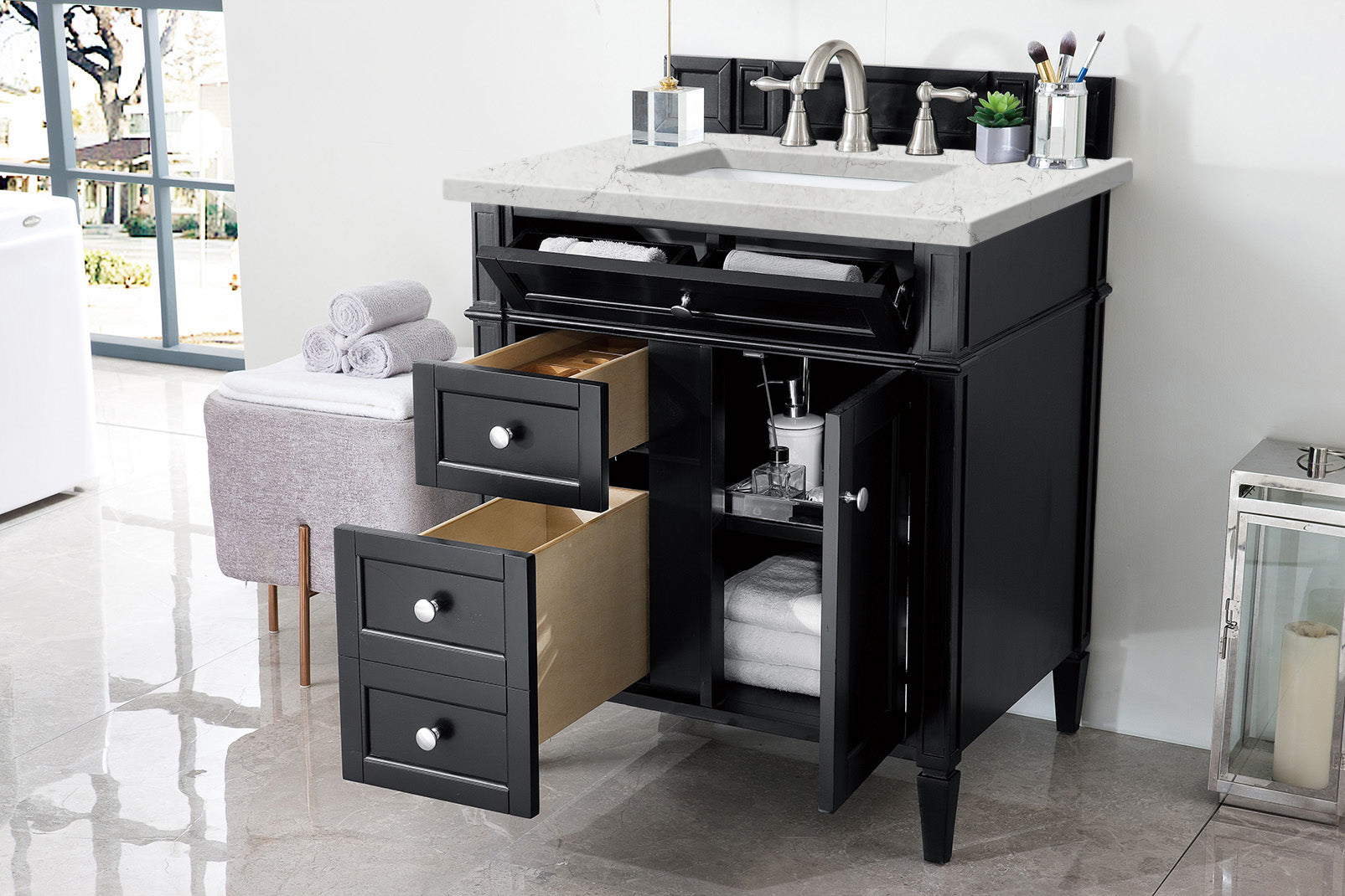 The Brittany 30" Black Onyx Single Vanity by James Martin Vanities features classic details that bridge both traditional and transitional styles. This beautiful piece of furniture includes one hide-away tip-out, top row drawer plus two full-depth side drawers, one of which is double-height for storage of taller items. This cabinet also has one door, which conceals an interior shelf for ample storage, and a bamboo drawer organizer. Handcrafted in yellow poplar solids and veneers with satin nickel hardware. Matching wood backsplash is included. The look is completed with a 3 CM eased edge Eternal Jasmine Pearl Silestone top by Cosentino and one white ceramic sink.