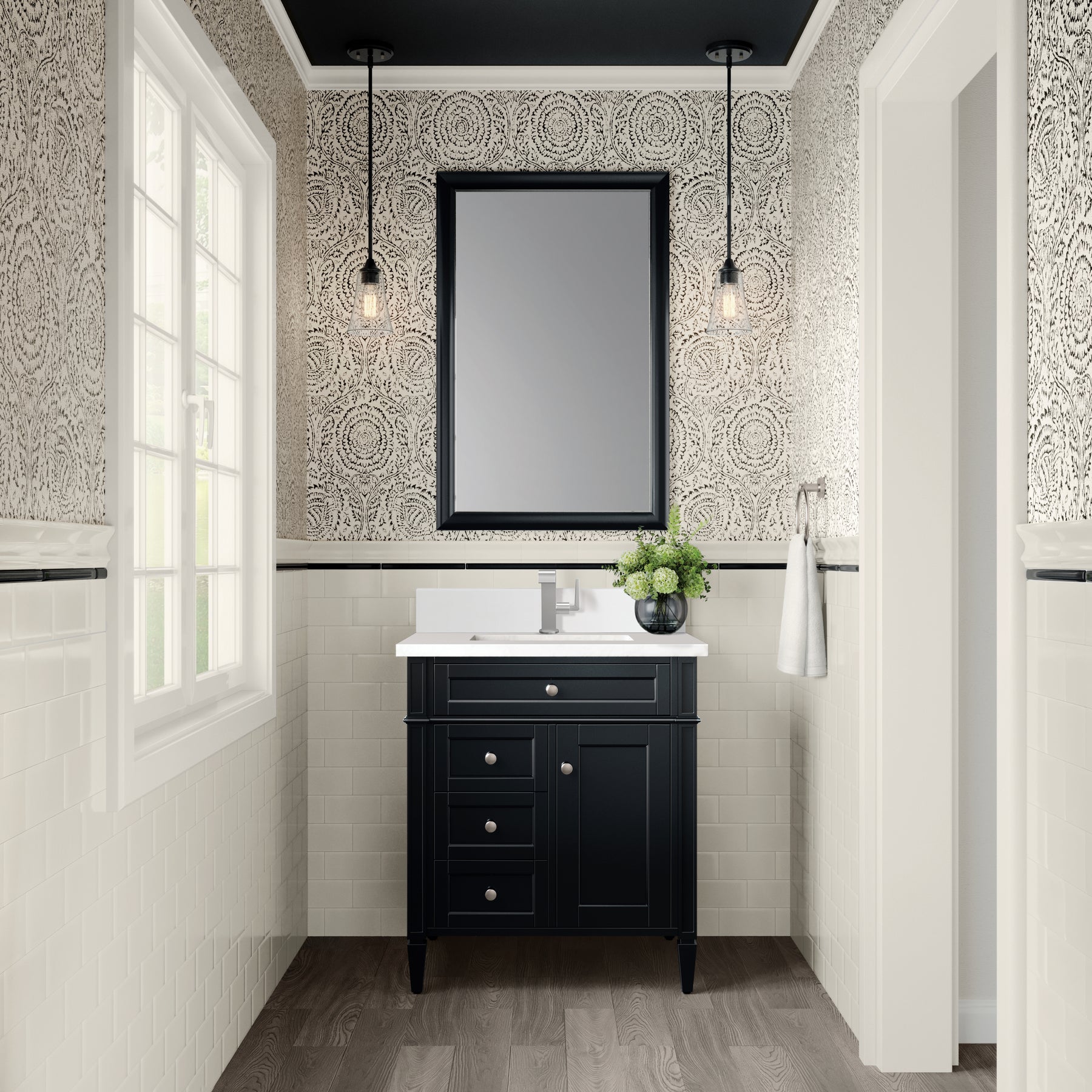 The Brittany 30" Black Onyx Single Vanity by James Martin Vanities features classic details that bridge both traditional and transitional styles. This beautiful piece of furniture includes one hide-away tip-out, top row drawer plus two full-depth side drawers, one of which is double-height for storage of taller items. This cabinet also has one door, which conceals an interior shelf for ample storage, and a bamboo drawer organizer. Handcrafted in yellow Poplar solids and veneers with satin nickel hardware. Matching wood backsplash is included. The look is completed with a 3 CM eased-edge countertop by Cosentino in White Zeus, which gives a crisp and clean finish to your vanity. It includes one pre-drilled hole for a single-hole faucet (not included), one matching stone backsplash, one white porcelain rectangular sink, as well as the appropriate mounting brackets for installation.