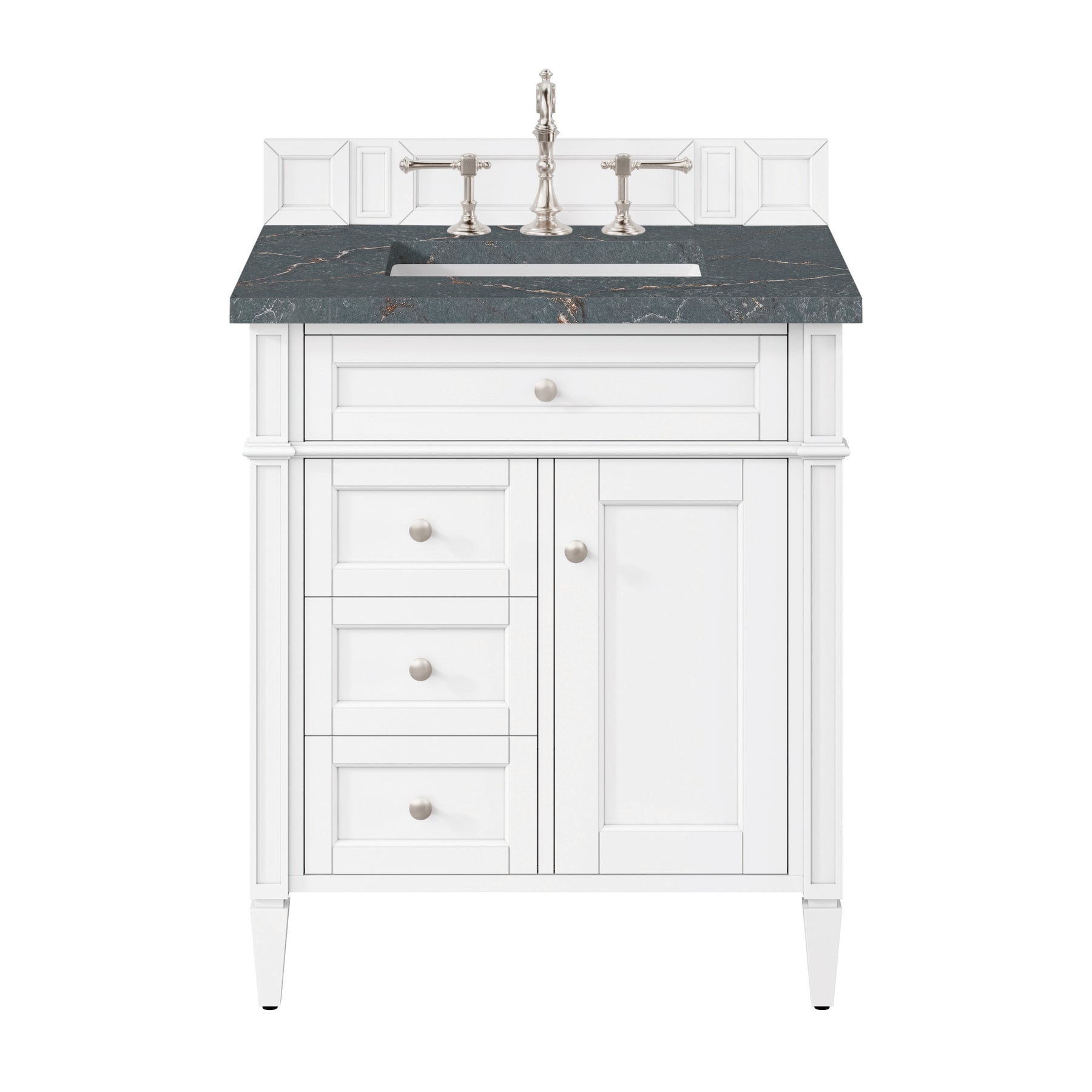 The Brittany 30" Bright White vanity by James Martin Vanities features classic details that bridge both Traditional and Transitional styles. This beautiful piece of furniture includes one hide-away tip out, top row drawer plus two full-depth side drawers, one of which is double-height for storage of taller items. This cabinet also has one door, which conceals an interior shelf for ample storage, and an bamboo drawer organizer. Hand crafted in hardwood solids with Satin Nickel hardware. Matching wood backsplash is included. The finish and hardware accents are enhanced by the Parisien Bleu Silestone top, offering a deep bluish hue with broad and intricate neutral veins highlighted by fine coppery accents.