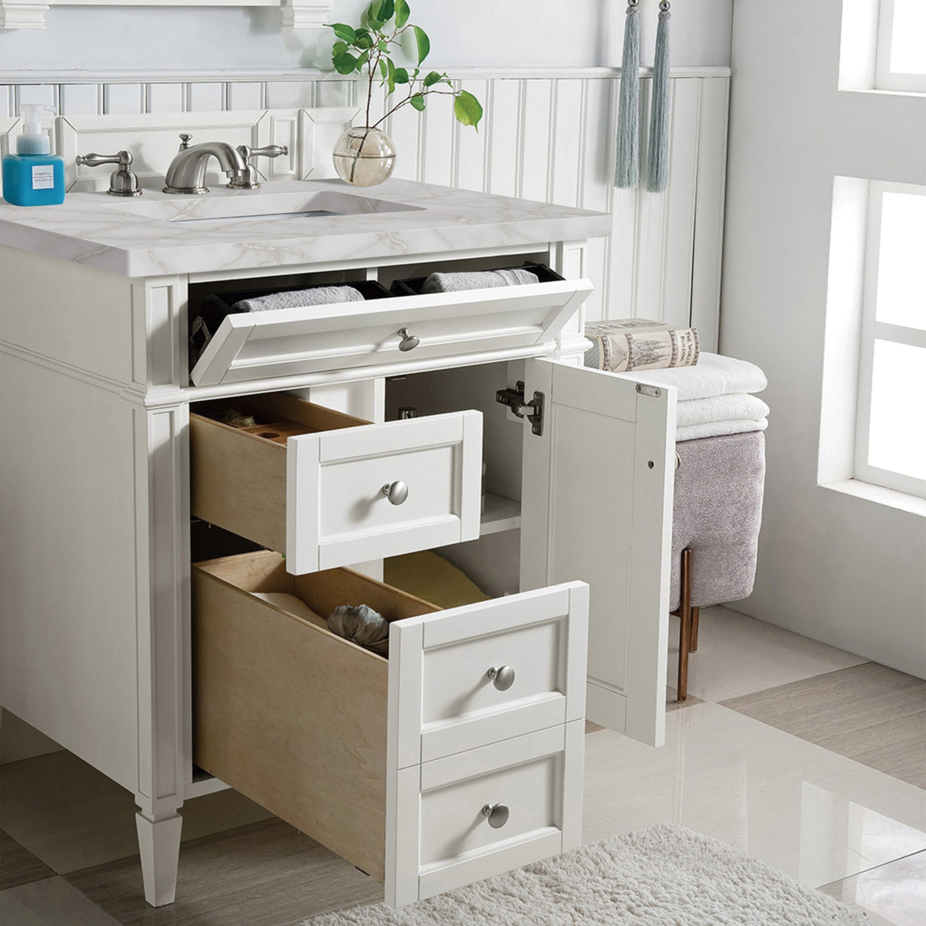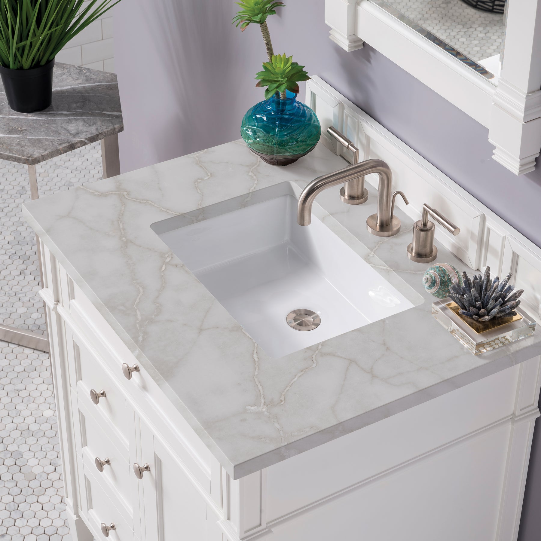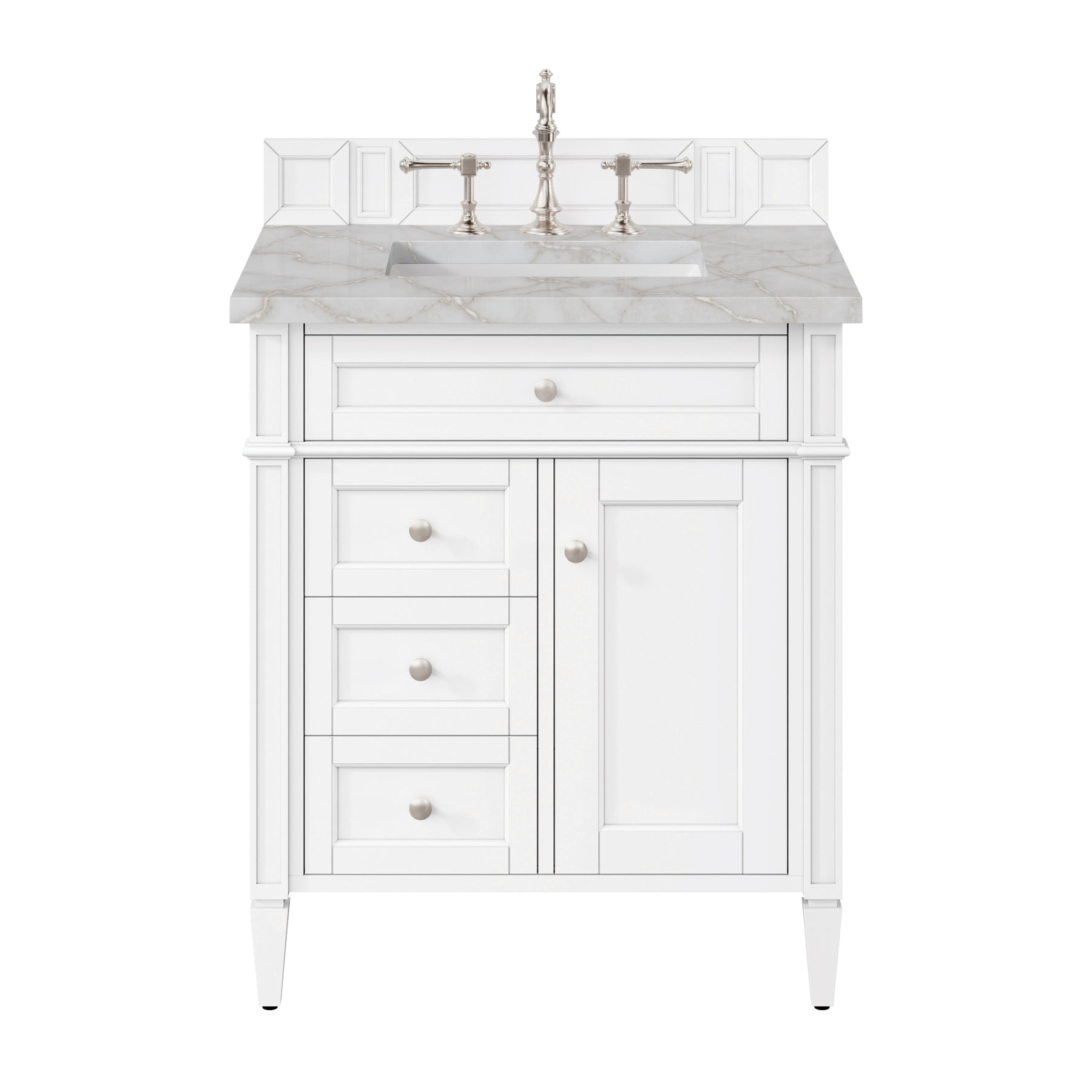 The Brittany 30" Bright White vanity by James Martin Vanities features classic details that bridge both Traditional and Transitional styles. This beautiful piece of furniture includes one hide-away tip out, top row drawer plus two full-depth side drawers, one of which is double-height for storage of taller items. This cabinet also has one door, which conceals an interior shelf for ample storage, and an bamboo drawer organizer. Hand crafted in hardwood solids with Satin Nickel hardware. Matching wood backsplash is included. With an elegant, neutral Victorian Silver Silestone top featuring champagne metallic accents, this vanity is an seamless integration of modern design and functionality.