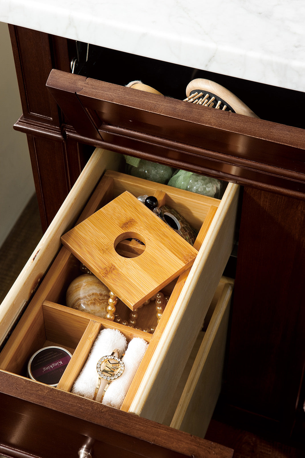 The Brittany 30" Burnished Mahogany Single Vanity by James Martin Vanities features classic details that bridge both traditional and transitional styles. This beautiful piece of furniture includes one hide-away tip-out, top row drawer plus two full-depth side drawers, one of which is double-height for storage of taller items. This cabinet also has one door, which conceals an interior shelf for ample storage, and a bamboo drawer organizer. Handcrafted in yellow poplar solids and veneers with satin nickel hardware. Matching wood backsplash is included. The look is completed with a 3 CM eased edge Carrara Marble top and white ceramic rectangular sink.