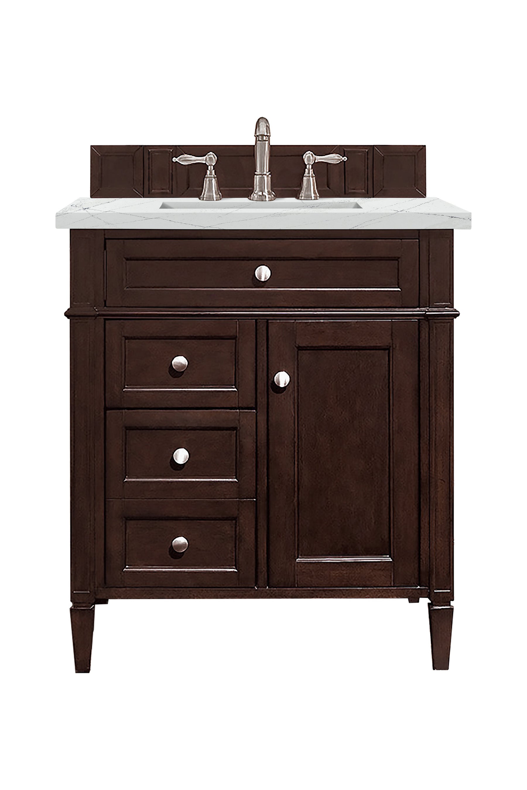The Brittany 30" Burnished Mahogany Single Vanity by James Martin Vanities features classic details that bridge both traditional and transitional styles. This beautiful piece of furniture includes one hide-away tip-out, top row drawer plus two full-depth side drawers, one of which is double-height for storage of taller items. This cabinet also has one door, which conceals an interior shelf for ample storage, and a bamboo drawer organizer. Handcrafted in yellow poplar solids and veneers with satin nickel hardware. Matching wood backsplash is included. The look is completed with a 3 CM eased edge Ethereal Noctis Silestone top by Cosentino and one white ceramic sink.