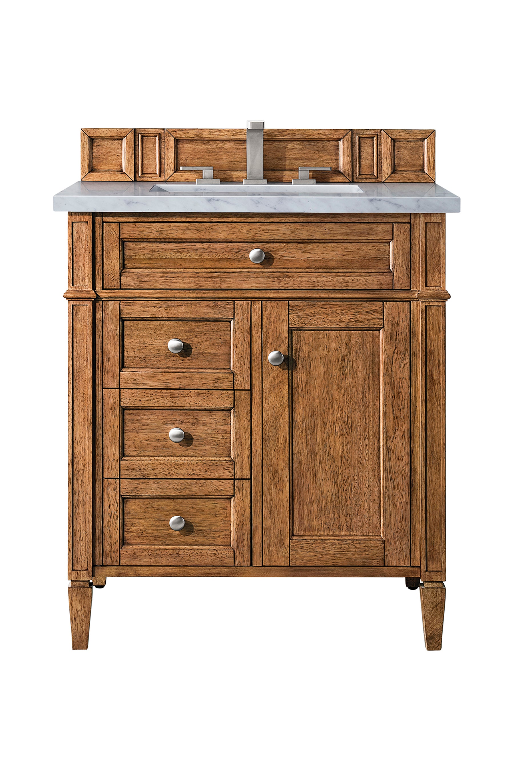 The Brittany 30" Saddle Brown Single Vanity by James Martin Vanities features classic details that bridge both traditional and transitional styles. This beautiful piece of furniture includes one hide-away tip-out, top row drawer plus two full-depth side drawers, one of which is double-height for storage of taller items. This cabinet also has one door, which conceals an interior shelf for ample storage, and a bamboo drawer organizer. Handcrafted in yellow poplar solids and veneers with satin nickel hardware. Matching wood backsplash is included. The look is completed with a 3 CM eased edge Carrara Marble top and white ceramic rectangular sink.