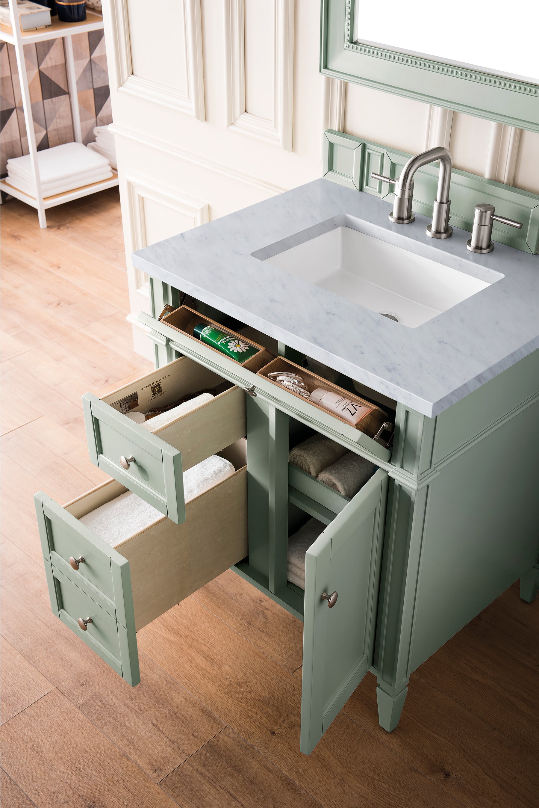 The Brittany 30" Sage Green Single Vanity by James Martin Vanities features classic details that bridge both traditional and transitional styles. This beautiful piece of furniture includes one hide-away tip-out, top row drawer plus two full-depth side drawers, one of which is double-height for storage of taller items. This cabinet also has one door, which conceals an interior shelf for ample storage, and a bamboo drawer organizer. Handcrafted in yellow poplar solids and veneers with satin nickel hardware. Matching wood backsplash is included. The look is completed with a 3 CM eased edge Carrara Marble top and white ceramic rectangular sink.
