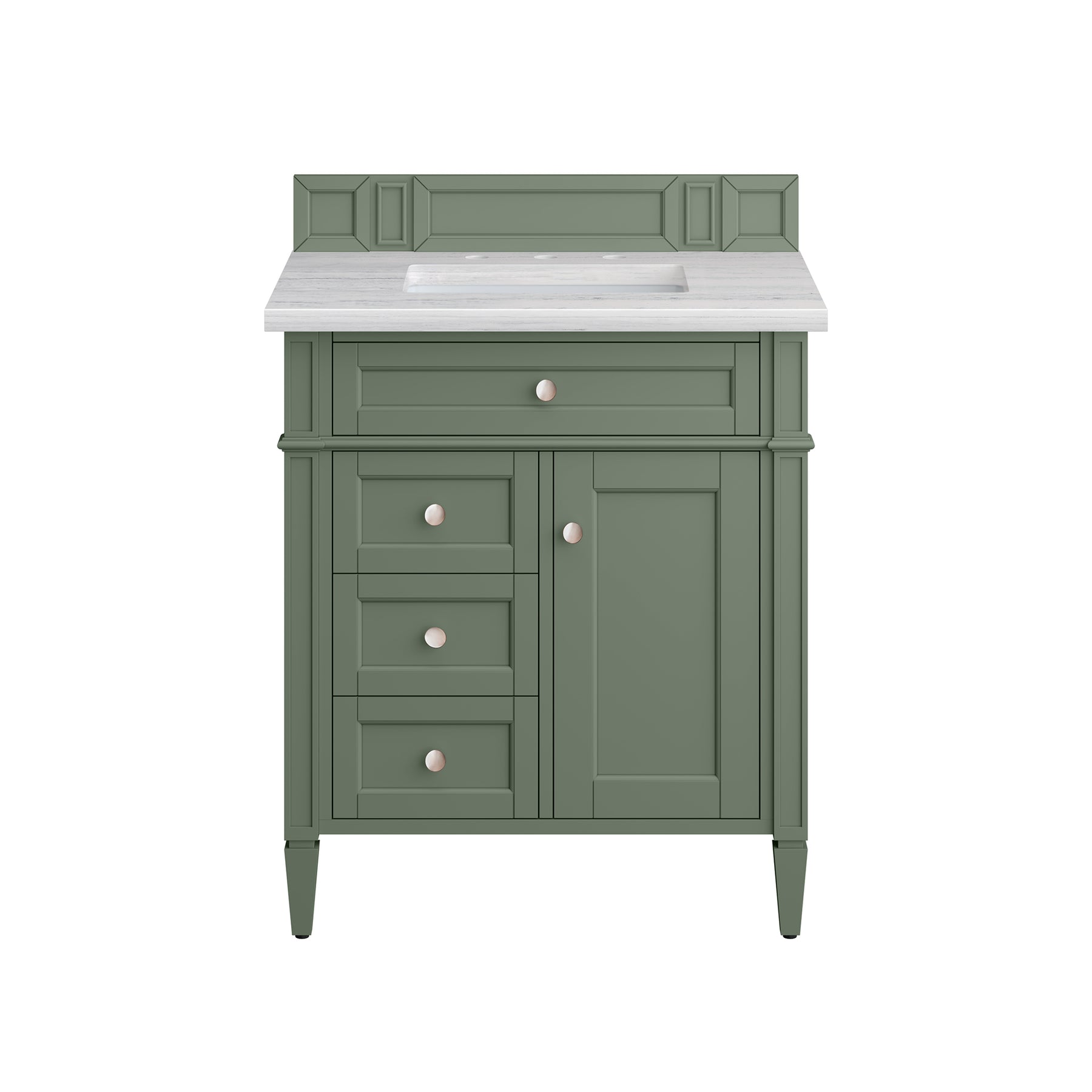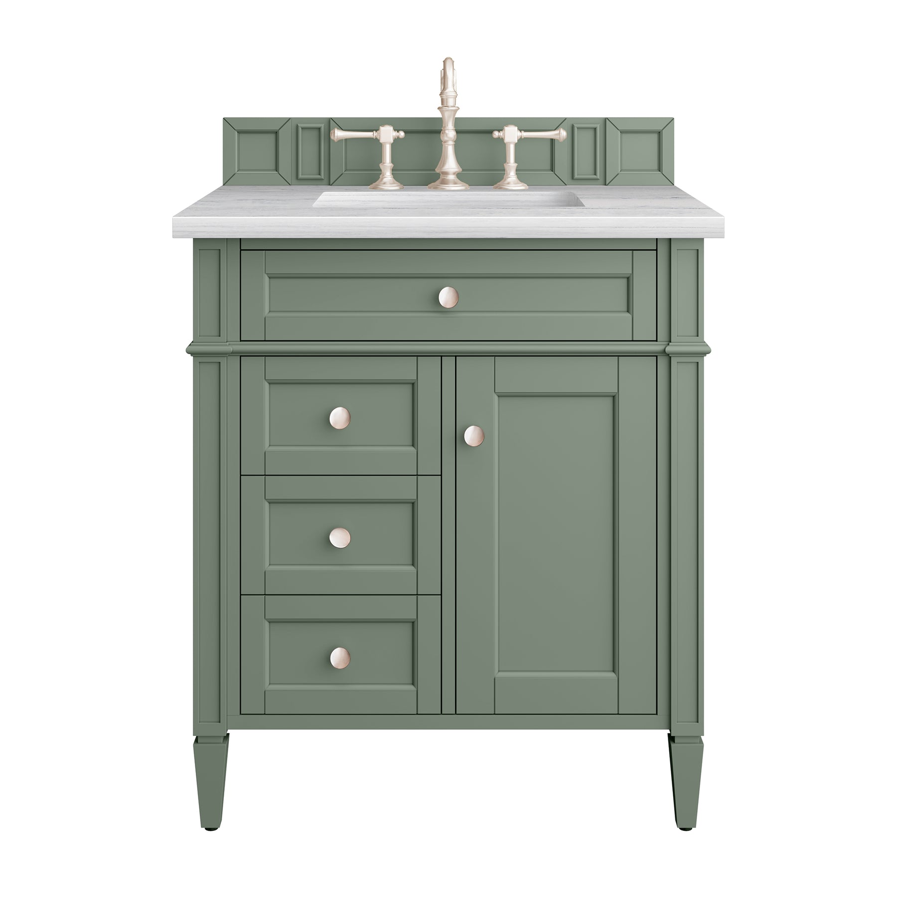The Smokey Celadon finish on the 30" Brittany Vanity adds a refreshing, natural element to any bathroom space. This moody, yet muted green, with subtle blue and grey undertones, brings the rich, timeless details of the Brittany collection to life. The 30" cabinet, with decorative wood backsplash, features optimal organization with one hide-away tip-out drawer plus two side drawers, one of which is a double height for storing taller items while the other contains a removable bamboo organizer tray. This cabinet also has one door, which conceals an interior shelf. All drawers are lined with an aluminum laminate surface for easy cleaning and are equipped with undermount soft-close slides. The Arctic Fall Solid Surface top adds an exquisite, modern touch with its soft white finish, grey undertones, and a natural-looking greyish horizontal veining. All of our 3 CM tops include a porcelain undermount sink.