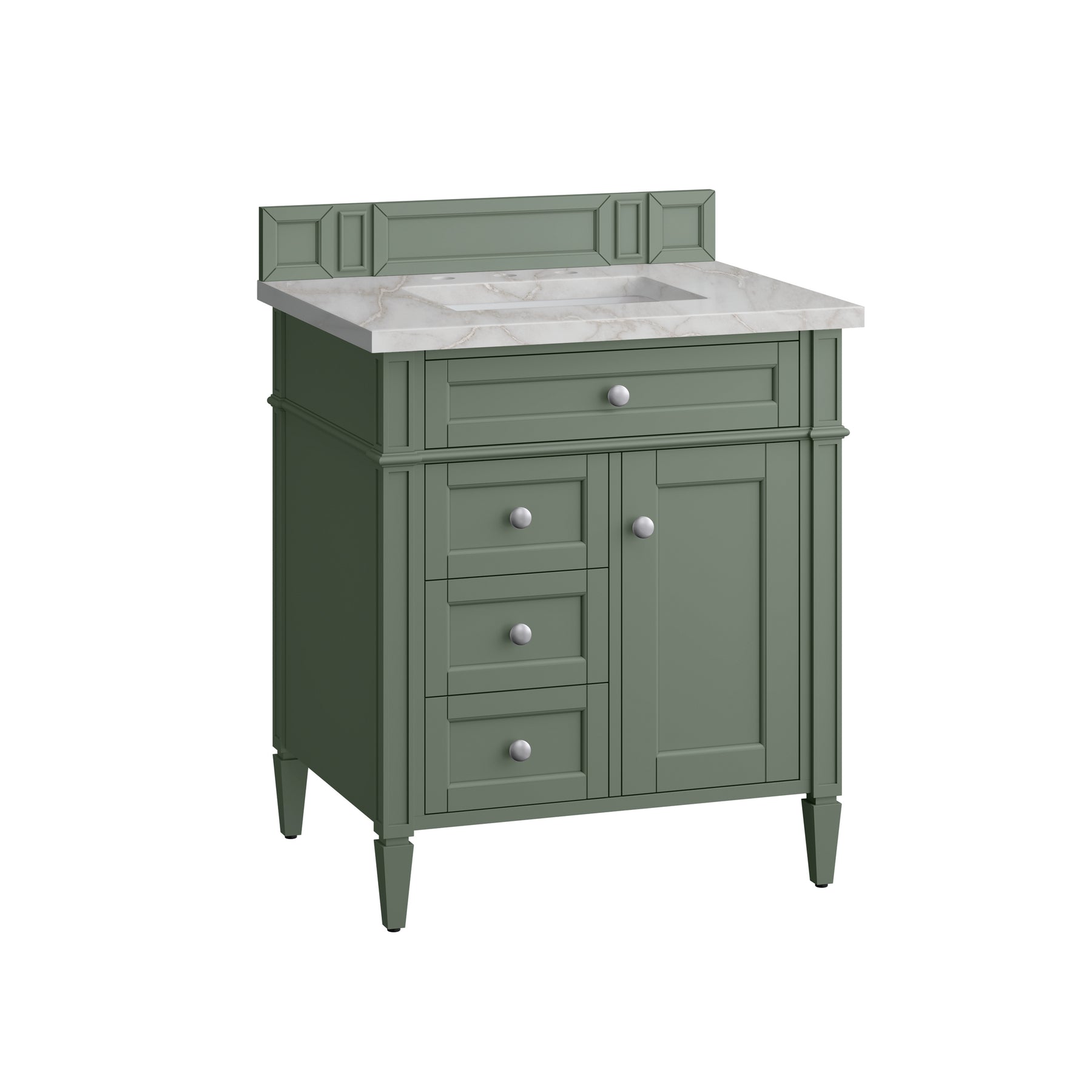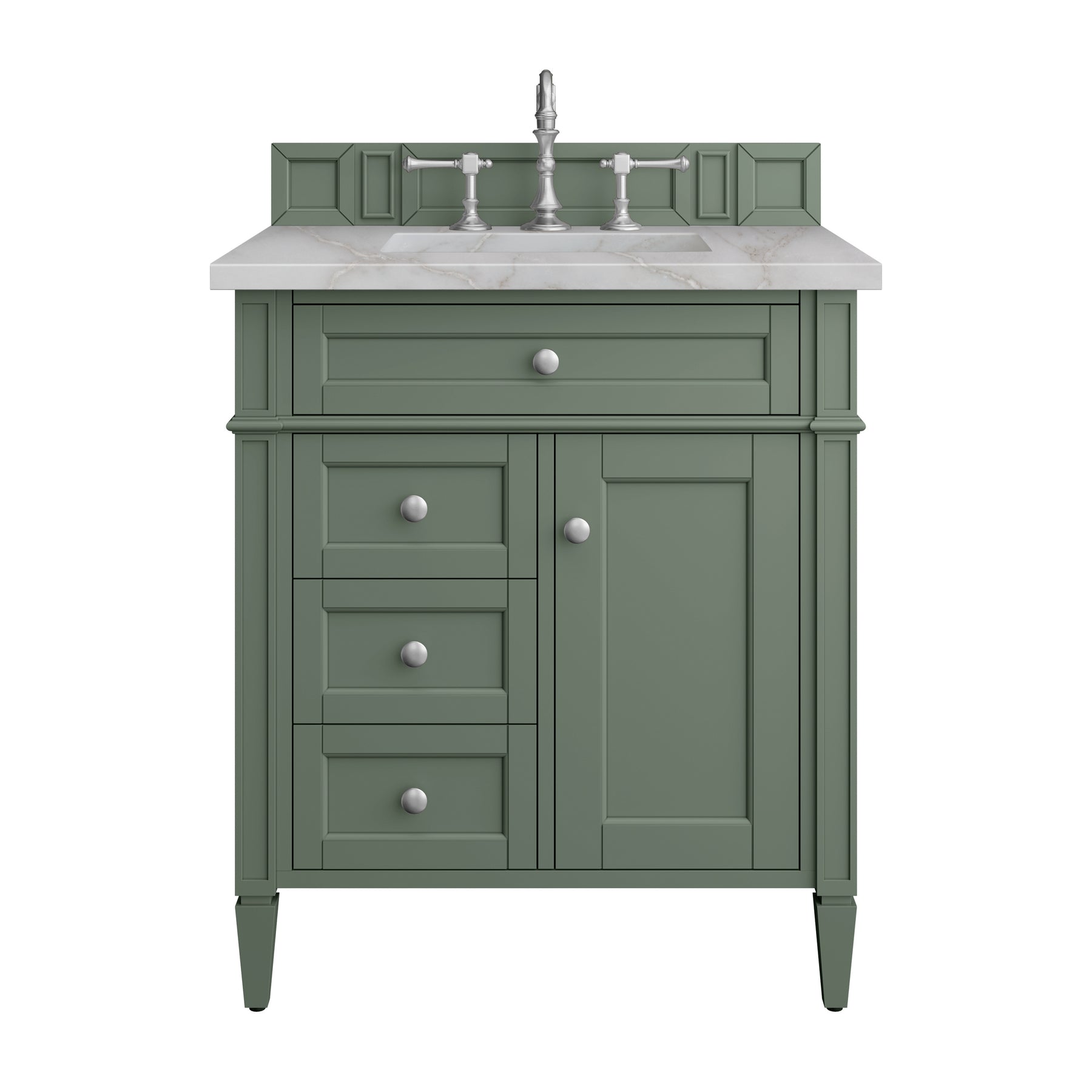 The Smokey Celadon finish on the 30" Brittany Vanity adds a refreshing, natural element to any bathroom space. This moody, yet muted green, with subtle blue and grey undertones, brings the rich, timeless details of the Brittany collection to life. The 30" cabinet, with decorative wood backsplash, features optimal organization with one hide-away tip-out drawer plus two side drawers, one of which is a double height for storing taller items while the other contains a removable bamboo organizer tray. This cabinet also has one door, which conceals an interior shelf. All drawers are lined with an aluminum laminate surface for easy cleaning and are equipped with undermount soft-close slides. The look is completed with a 3 CM eased-edge countertop by Cosentino in Victorian Silver, which features a cool background tone with silver and dark neutral veins, complimented with champagne metallic accents. It includes pre-drilled holes for an 8-inch widespread faucet (not included), one white porcelain rectangular sink, as well as the appropriate mounting brackets for installation.