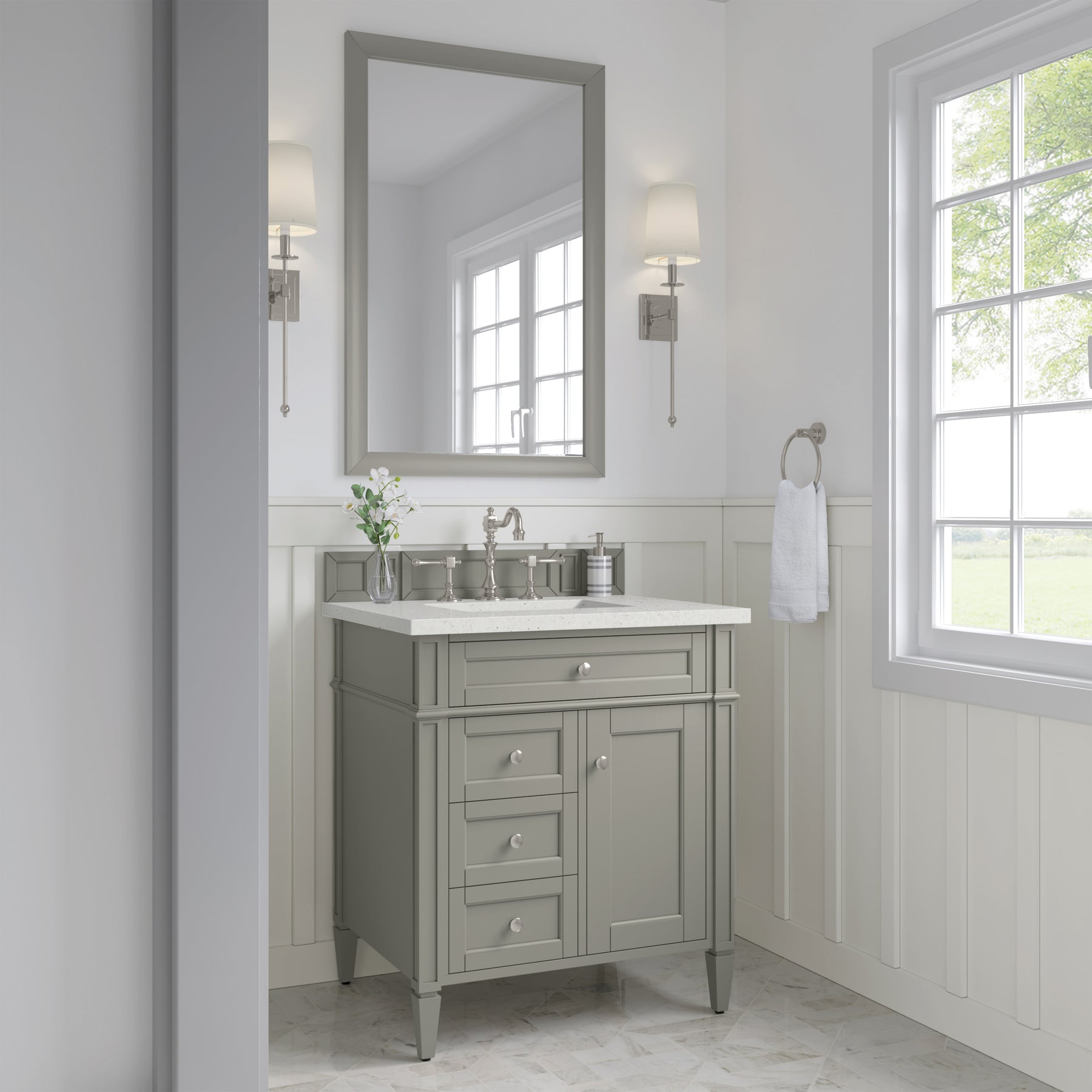 The Brittany 30" Urban Gray Single Vanity by James Martin Vanities features classic details that bridge both traditional and transitional styles. This beautiful piece of furniture includes one hide-away tip-out, top row drawer plus two full-depth side drawers, one of which is double-height for storage of taller items. This cabinet also has one door, which conceals an interior shelf for ample storage, and a bamboo drawer organizer. Handcrafted in yellow Poplar solids and veneers with satin nickel hardware. Matching wood backsplash is included. The look is completed with a 3 CM eased-edge countertop by Cosentino in Lime Delight, which brings a warm, textured beige tones in a suede finish. It includes pre-drilled holes for an 8-inch widespread faucet (not included), one white porcelain rectangular sink, as well as the appropriate mounting brackets for installation.
