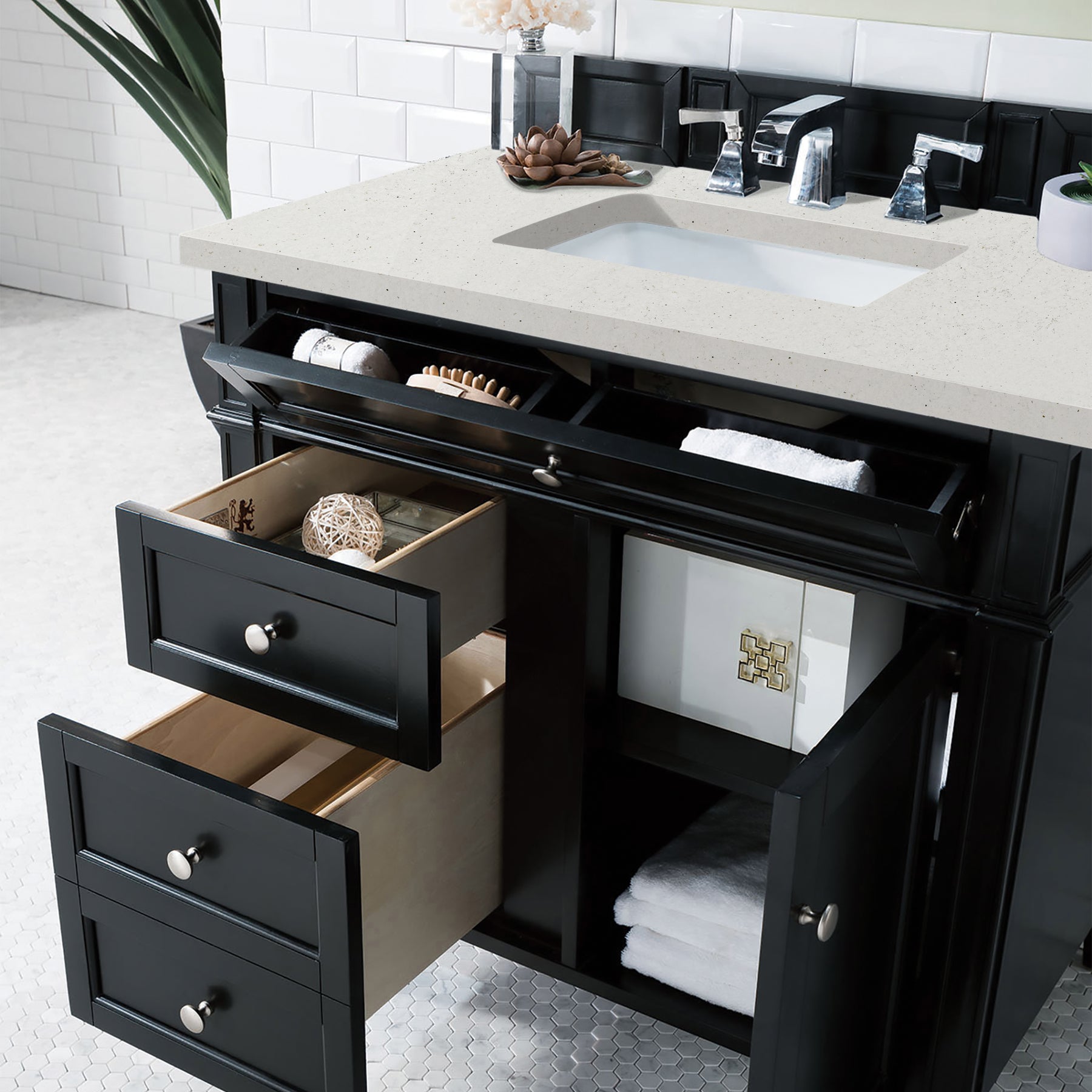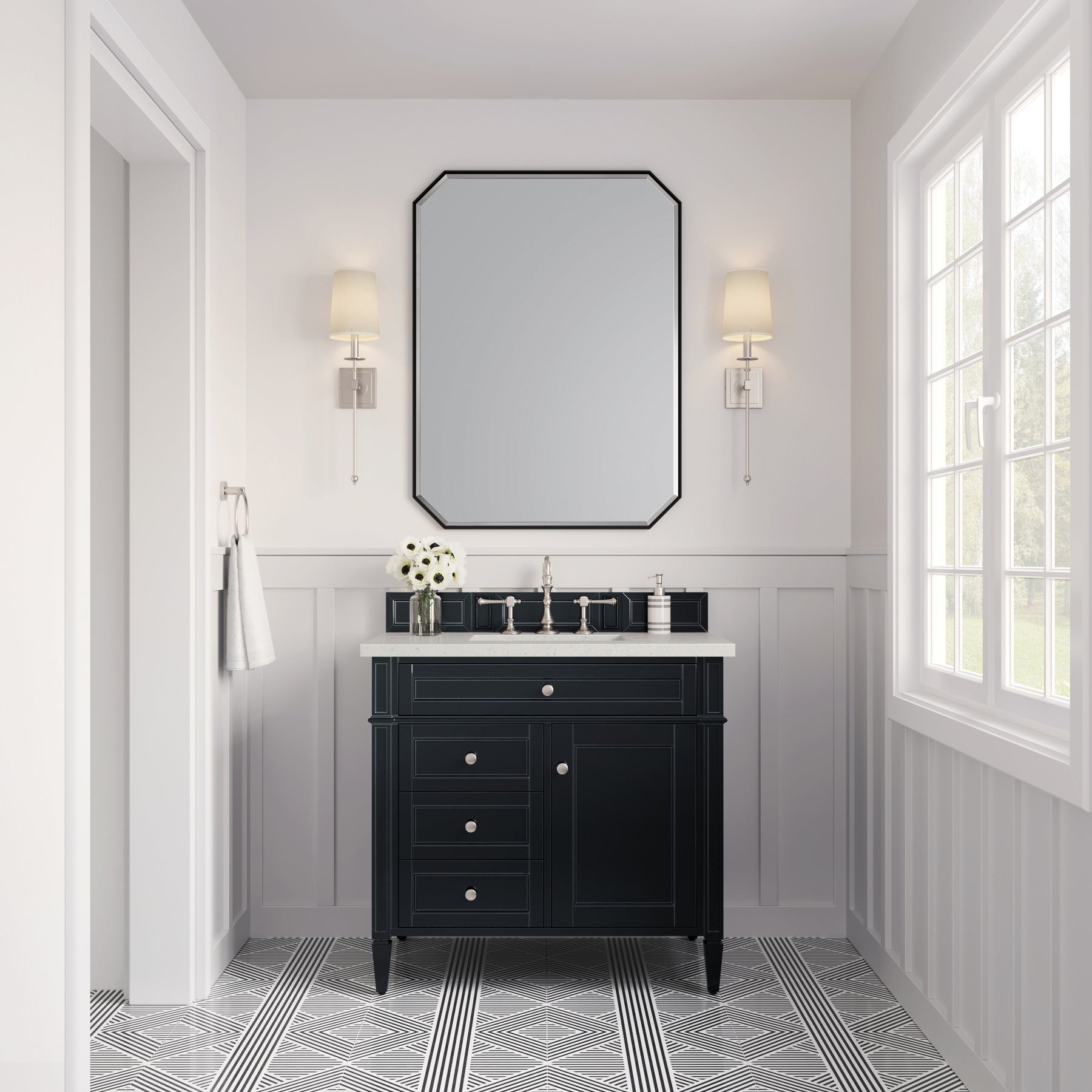 The Brittany 36" Black Onyx Single Vanity by James Martin Vanities features classic details that bridge both traditional and transitional styles. This beautiful piece of furniture includes one hide-away tip-out, top row drawer plus two full-depth side drawers, one of which is double-height for storage of taller items. This cabinet also has one door, which conceals an interior shelf for ample storage. Handcrafted in yellow Poplar solids and veneers with satin nickel hardware. Matching wood backsplash is included. The look is completed with a 3 CM eased-edge countertop by Cosentino in Lime Delight, which brings a warm, textured beige tones in a suede finish. It includes pre-drilled holes for an 8-inch widespread faucet (not included), one white porcelain rectangular sink, as well as the appropriate mounting brackets for installation.