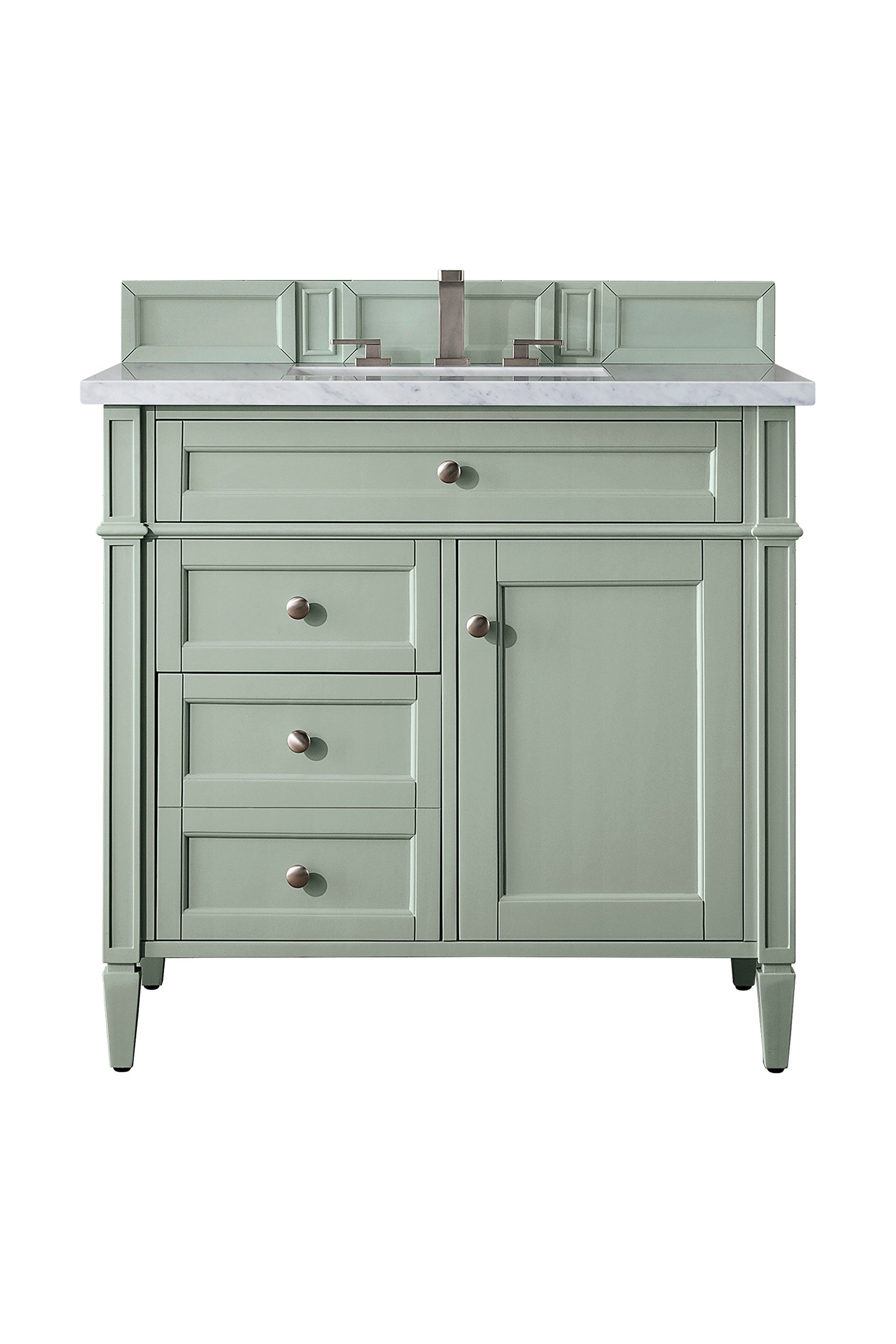The Brittany 36" Sage Green Single Vanity by James Martin Vanities features classic details that bridge both traditional and transitional styles. This beautiful piece of furniture includes one hide-away tip-out, top row drawer plus two full-depth side drawers, one of which is double-height for storage of taller items. This cabinet also has one door, which conceals an interior shelf for ample storage. Handcrafted in yellow poplar solids and veneers with satin nickel hardware. Matching wood backsplash is included. The look is completed with a 3 CM eased edge Carrara Marble top and white ceramic rectangular sink.