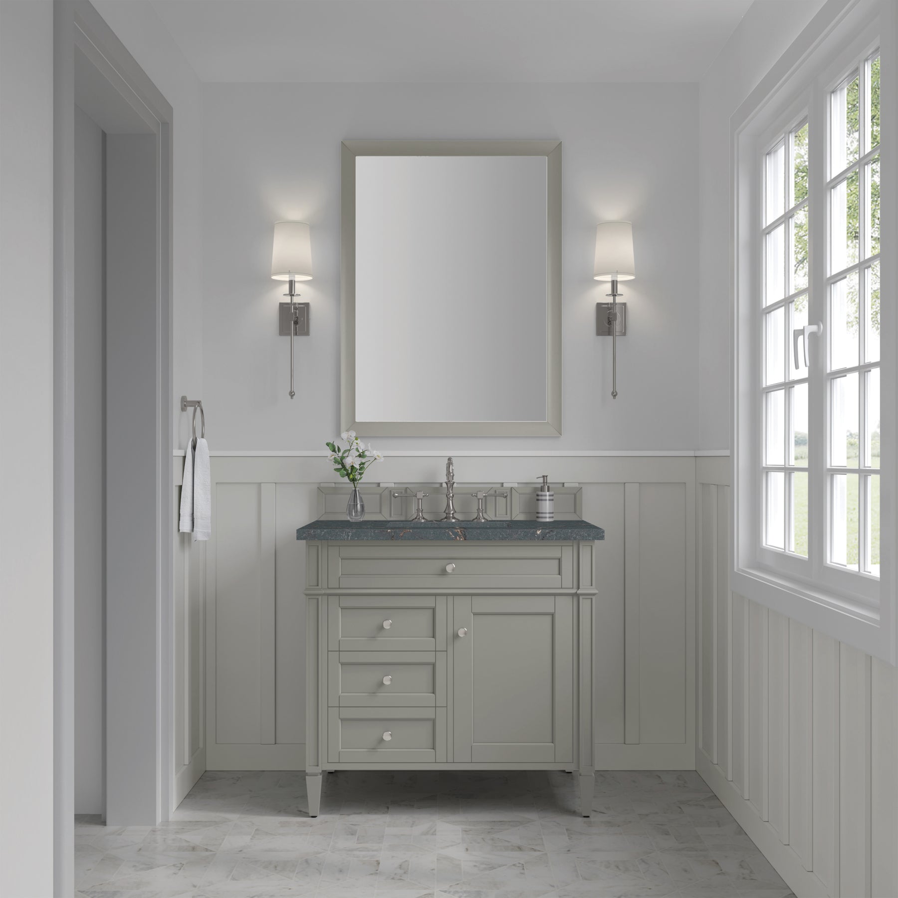 The Brittany 36" Urban Gray Single Vanity by James Martin Vanities features classic details that bridge both traditional and transitional styles. This beautiful piece of furniture includes one hide-away tip-out, top row drawer plus two full-depth side drawers, one of which is double-height for storage of taller items. This cabinet also has one door, which conceals an interior shelf for ample storage. Handcrafted in yellow Poplar solids and veneers with satin nickel hardware. Matching wood backsplash is included. The look is completed with a 3 CM eased-edge countertop by Cosentino in Parisien Bleu, featuring intricate neutral veining and striking coppery accents coursing through deep blue hues. It includes pre-drilled holes for an 8-inch widespread faucet (not included), one white porcelain rectangular sink, as well as the appropriate mounting brackets for installation.
