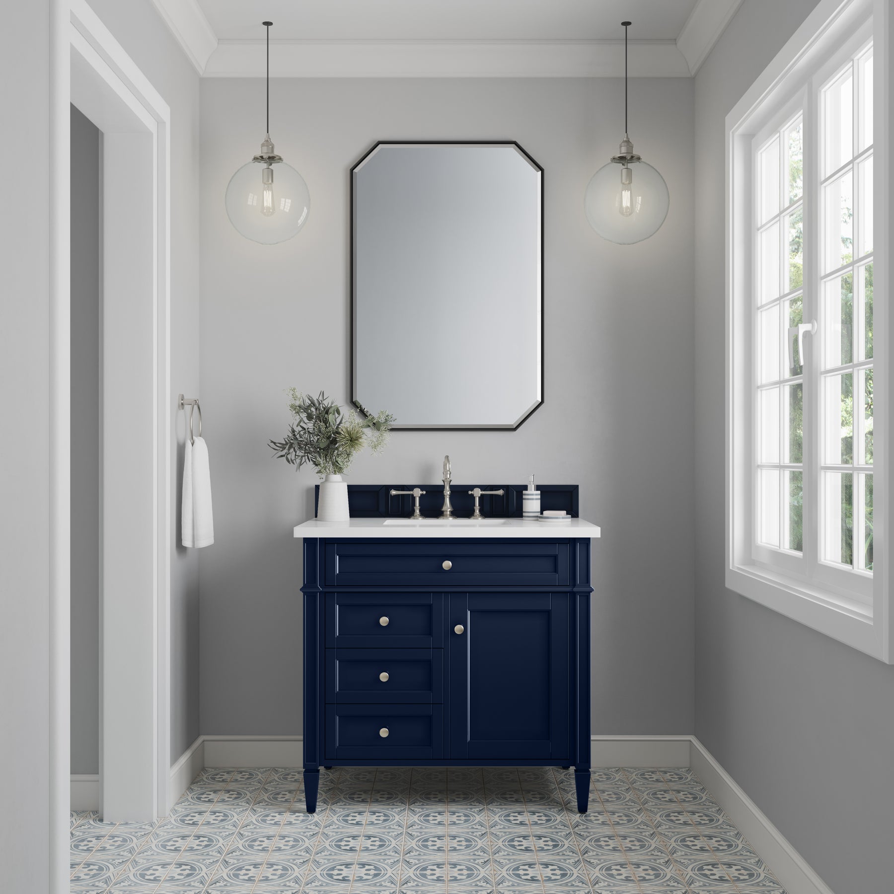 The Brittany 36" Victory Blue Single Vanity by James Martin Vanities features classic details that bridge both traditional and transitional styles. This beautiful piece of furniture includes one hide-away tip-out, top row drawer plus two full-depth side drawers, one of which is double-height for storage of taller items. This cabinet also has one door, which conceals an interior shelf for ample storage. Handcrafted in yellow poplar solids and veneers with satin nickel hardware. Matching wood backsplash is included. The look is completed with a 3 CM eased edge White Zeus Silestone top by Cosentino and one white ceramic sink.