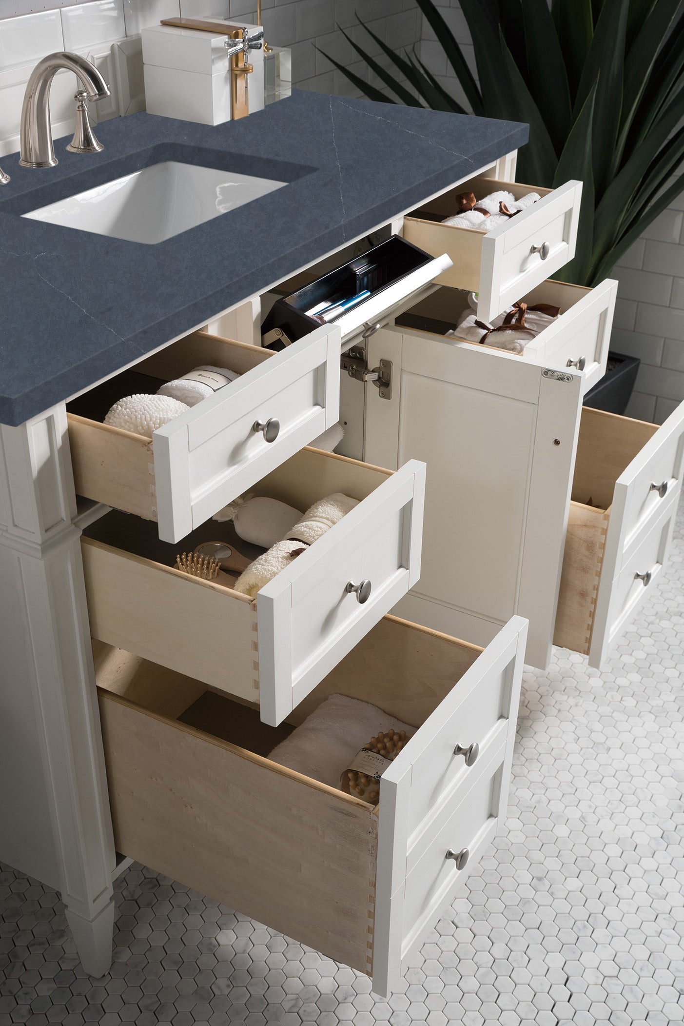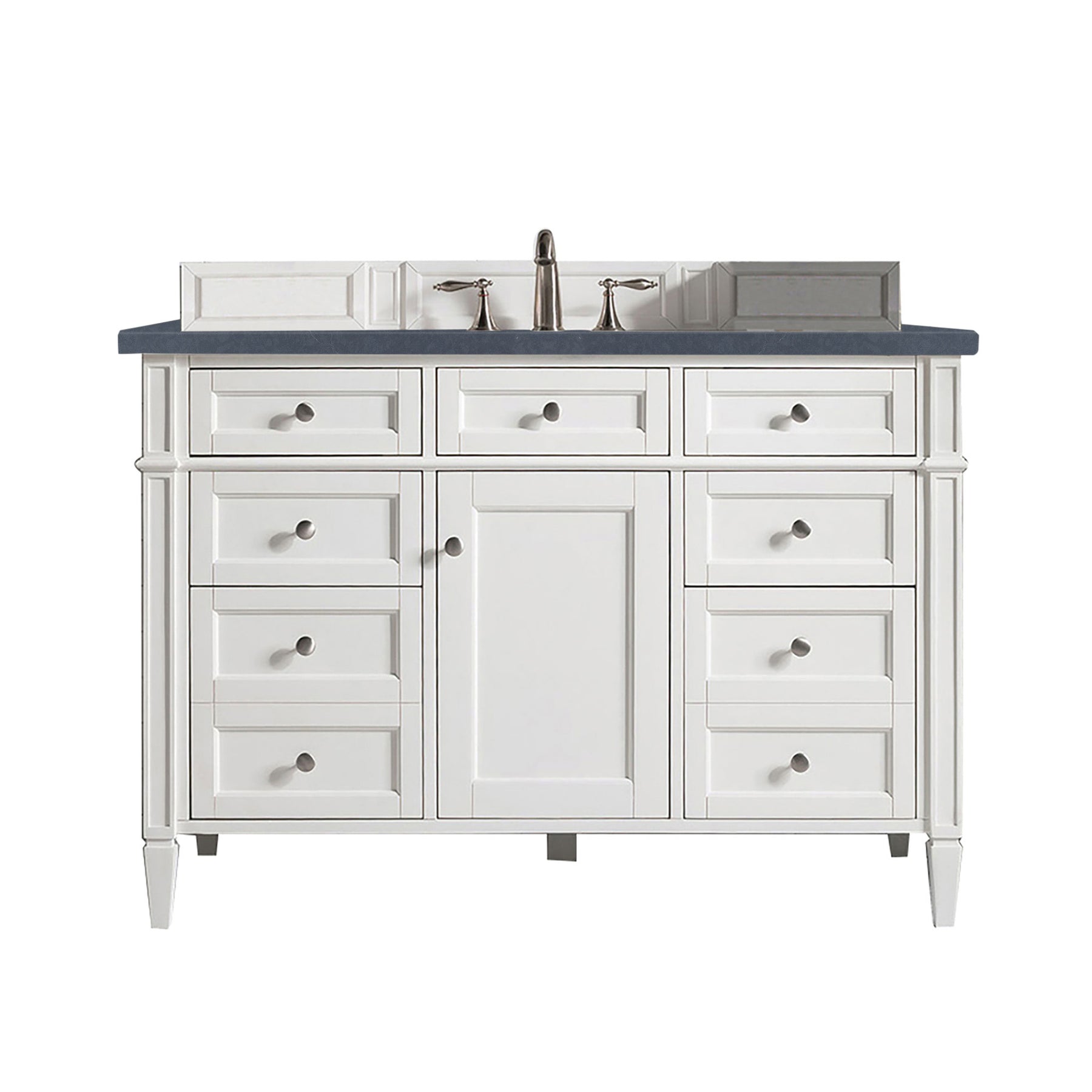 The Brittany 48" Bright White single vanity by James Martin Vanities features classic details that bridge both traditional and transitional styles. This beautiful piece of furniture includes one hide-away top row tip-out drawer, plus six full-depth drawers, two of which are double-height for storage of taller items. This cabinet also has one door, which conceals an interior shelf, for ample storage. Hand crafted in yellow poplar solids and yellow poplar veneers with Satin Nickel hardware. Matching wood backsplash is included. Completing this piece is a distinguished top, characterized by depth and a sense of movement with a suede finish. The Charcoal Soapstone Silestone top by Cosentino has the new n-boost technology, which helps prevent the adhesion of liquids, enhances shine, and intensifies the color of this top.