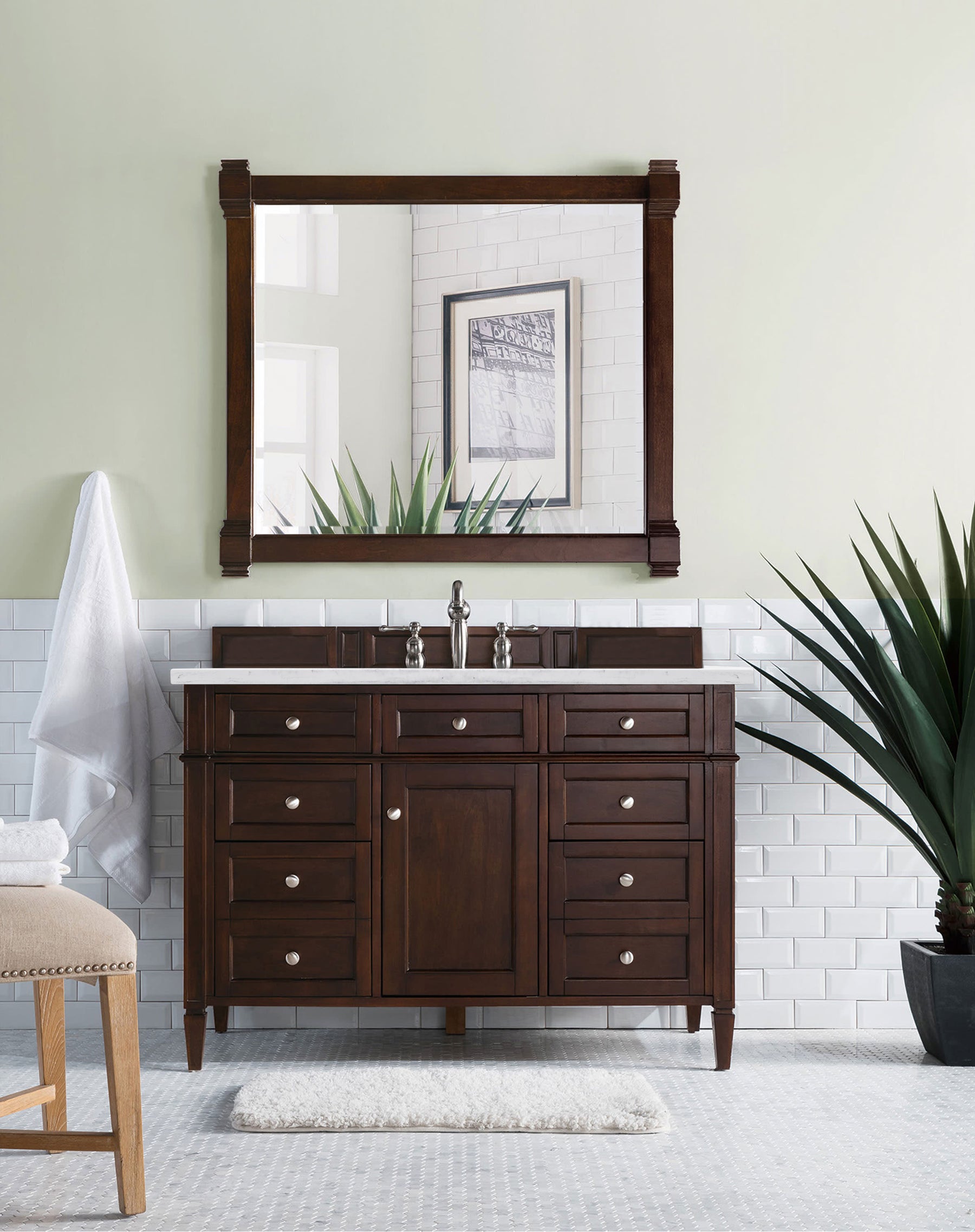 The Brittany 48" Burnished Mahogany Single Vanity by James Martin Vanities features classic details that bridge both traditional and transitional styles. This beautiful piece of furniture includes one hide-away top row tip-out drawer, plus six full-depth drawers, two of which are double-height for storage of taller items. This cabinet also has one door, which conceals an interior shelf for ample storage. Handcrafted in yellow poplar solids and veneers with satin nickel hardware. Matching wood backsplash is included. The look is completed with a 3 CM eased edge 3 CM eased edge Arctic Fall Solid Surface top with one white ceramic rectangular sink.