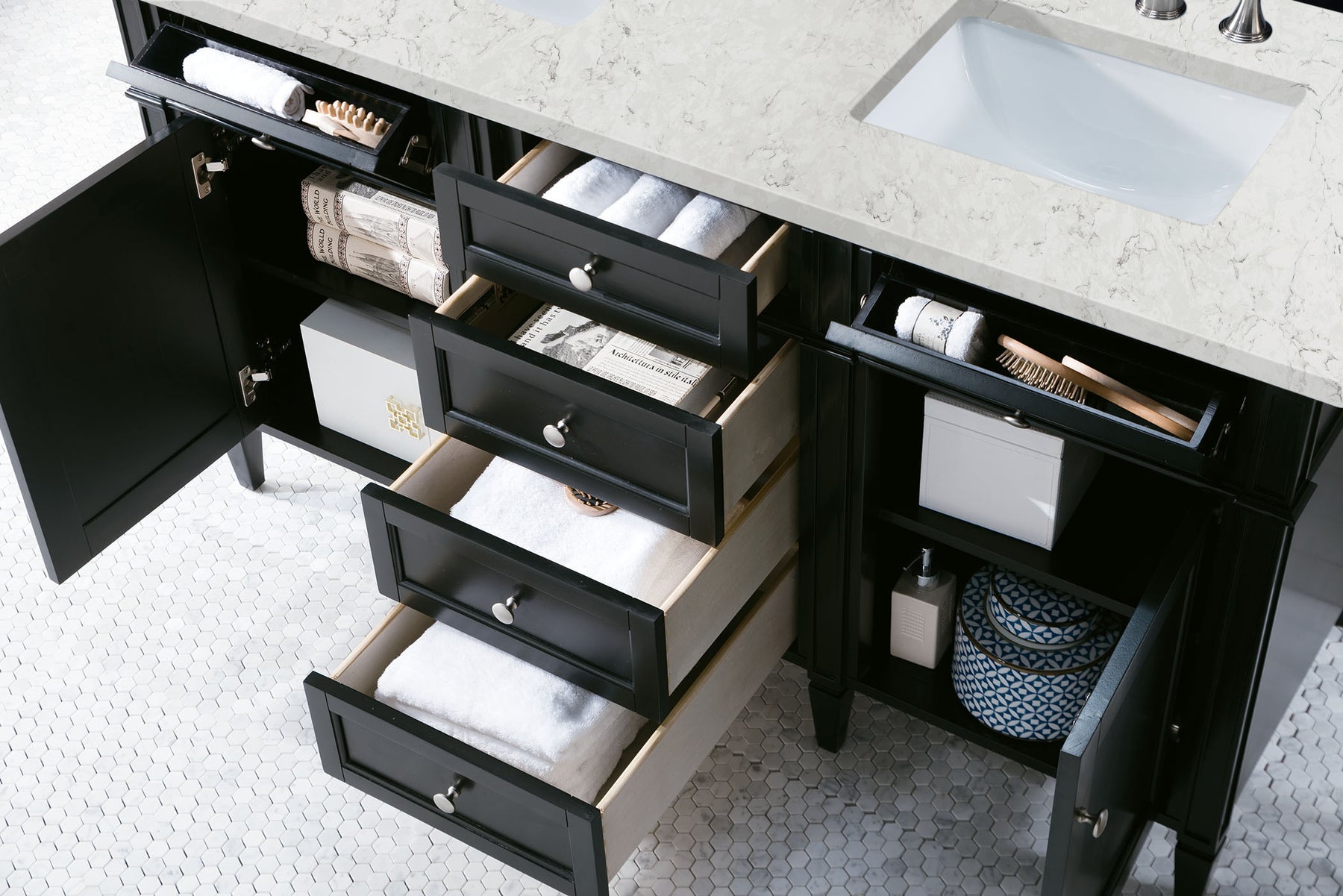 The Brittany 60" Black Onyx Double Vanity by James Martin Vanities features classic details that bridge both traditional and transitional styles. This beautiful piece of furniture includes two hide-away tip-out, top row drawers and four full-depth drawers. This cabinet also has two doors, which conceal an interior shelf for ample storage. Handcrafted in yellow poplar solids and veneers with satin nickel hardware. Matching wood backsplash is included. The look is completed with a 3 CM eased edge 3 CM eased edge Eternal Jasmine Pearl Silestone top with two white ceramic rectangular sinks.