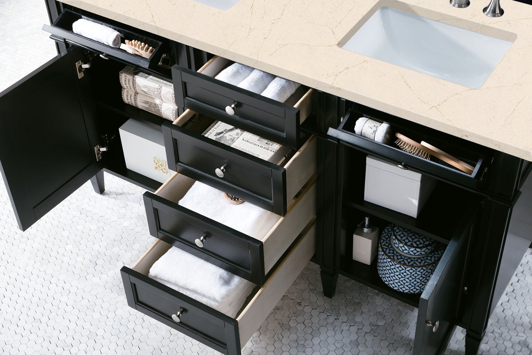 The Brittany 60" Black Onyx Double Vanity by James Martin Vanities features classic details that bridge both traditional and transitional styles. This beautiful piece of furniture includes two hide-away tip-out, top row drawers and four full-depth drawers. This cabinet also has two doors, which conceal an interior shelf for ample storage. Handcrafted in yellow poplar solids and veneers with satin nickel hardware. Matching wood backsplash is included. The look is completed with a 3 CM eased edge 3 CM eased edge Eternal Marfil Silestone top with two white ceramic rectangular sinks.